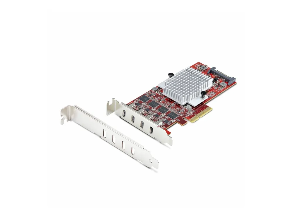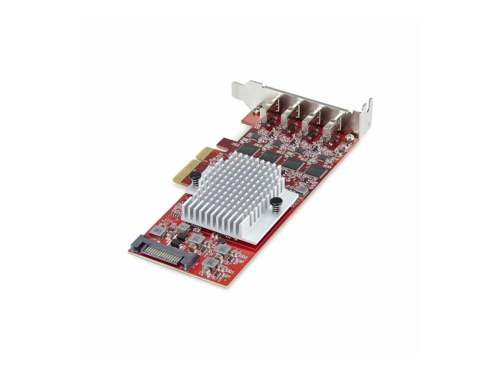 The StarTech.com 4-Port USB Type-C PCIe Card enhances connectivity by providing four USB-C 3.2 Gen 2 ports, allowing for efficient data transfer rates of up to 10 Gbps. This plug-in card is designed for seamless integration into systems with a PCI Express 3.0 x4 interface and is low-profile, ensuring it fits in compact spaces. With built-in SATA power connectors, this card supports both external and internal connections, making it versatile for various setups. It operates reliably within a temperature range of 0°C to 85°C and maintains functionality in humidity levels between 20 to 80% RH, suitable for diverse environments.