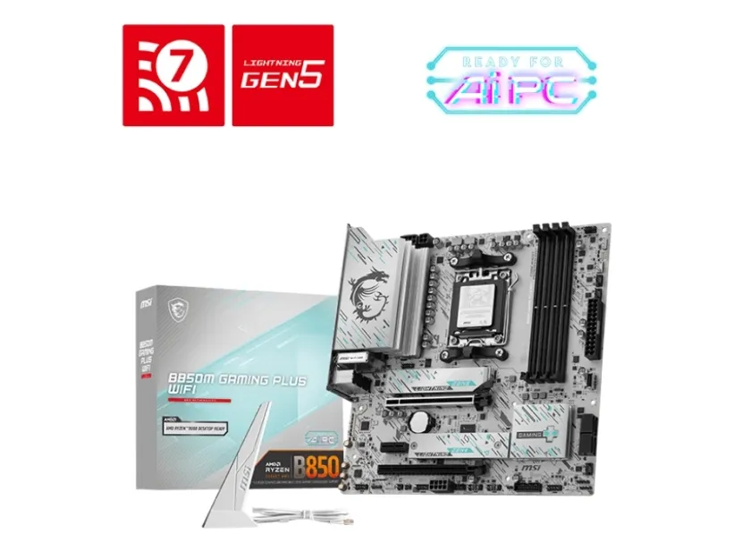 The MSI B850M GAMING PLUS WIFI motherboard offers gamers and PC enthusiasts a robust platform to build their systems. It supports the AMD B850 chipset and Ryzen processors, including the 7000, 8000, and 9000 Series. With four DIMM slots for DDR5 SDRAM and support for RAM speeds up to 8200 MT/s, this motherboard ensures optimal performance for demanding applications and serious gaming. Enhanced with features such as MSI Audio Boost, Mystic Light, and a durable 6 Layer PCB, it provides functionality along with a stylish element to any build. Connectivity is a strong suit with a rich selection of ports, including high-speed USB 3.2 Gen 2, DisplayPort, HDMI, and generous storage options with 4 x SATA-600 (RAID) and 2 x M.2 slots. The network capabilities include 5 Gigabit Ethernet connectivity and advanced Wi-Fi 7 support, ensuring fast Internet access. Additionally, features like Frozr AI Cooling and EZ Debug LED make troubleshooting and system maintenance smooth and efficient, further enhancing the user experience.
