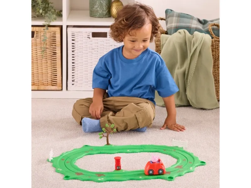 Det lille røde Peppa Pig Whizz-Around bil-sæt indeholder Gurli i den klassiske røde bil, sammen med vejbanespor og tilbehør. Banesættet samles med et simpelt puslespilsystem, som er nemt for små hænder at sætte sammen. Tilpas banen med det medfølgende tilbehør – og tryk så på Gurlis hoved, og se hende køre!