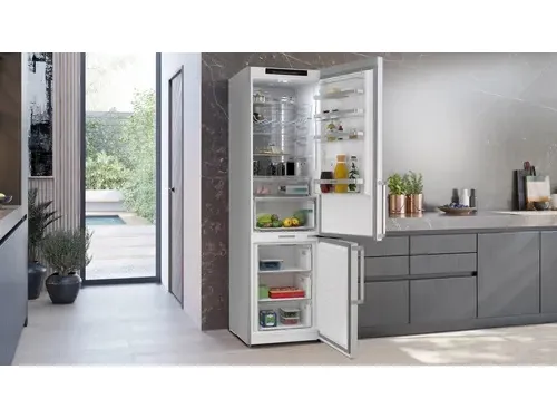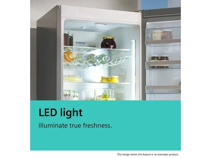 Energy-efficient with an energy consumption of just 112 kWh per year, this appliance is designed to help save on utility costs. Additional features include a softStart LED interior lighting system that illuminates the refrigerator, and a noise level of only 29 dB(A), ensuring quiet operation. The Siemens iQ500 also includes a temperature alert system with both audible and visual indicators, enhancing safety and ensuring optimal food storage conditions. With its sleek design and electronic control system, this refrigerator/freezer is a stylish and efficient addition to any kitchen.