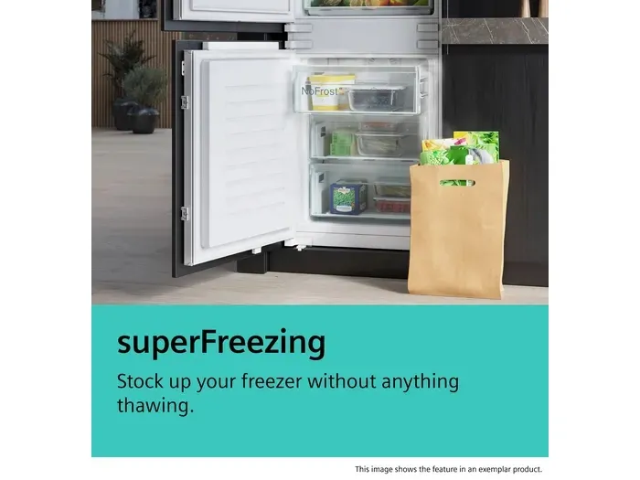 The Siemens iQ500 KG39NAIAU refrigerator/freezer offers a blend of style, efficiency, and features designed to meet food storage needs. With a total net capacity of 363 liters, this bottom-freezer unit provides space for groceries. The refrigerator compartment includes a hyperFresh Zone for better preservation of fruits and vegetables, while the adjustable safety glass shelves ensure versatility in storage. Equipped with a frost-free cooling system, this model eliminates defrosting, allowing for a convenient experience.