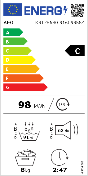 AEG TR9T75680. Appliance placement: Freestanding, Loading type: Front-load, Drying system: Heat pump. Rated capacity: 8 kg, Condensation efficiency class: B, Drying programs: Cotton, Delicate/silk, Eco, Hygiene/anti-allergy, Mix, Outdoor/sport, Wool. Energy efficiency class: C, Energy consumption per 100 cycles: 98 kWh, Energy consumption: 0.98 kWh. Depth: 663 mm, Width: 596 mm, Height: 850 mm. Package weight: 52.2 kg