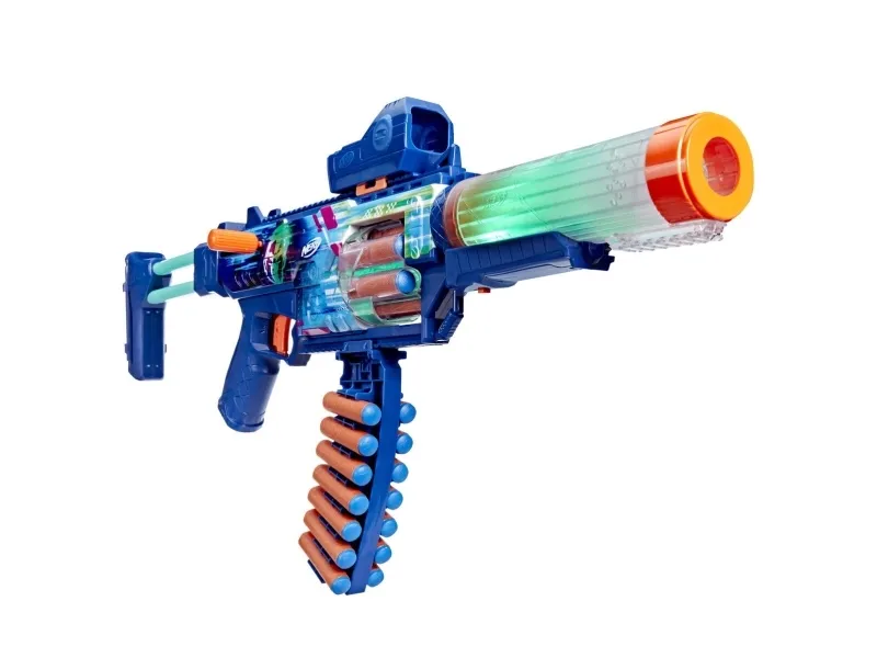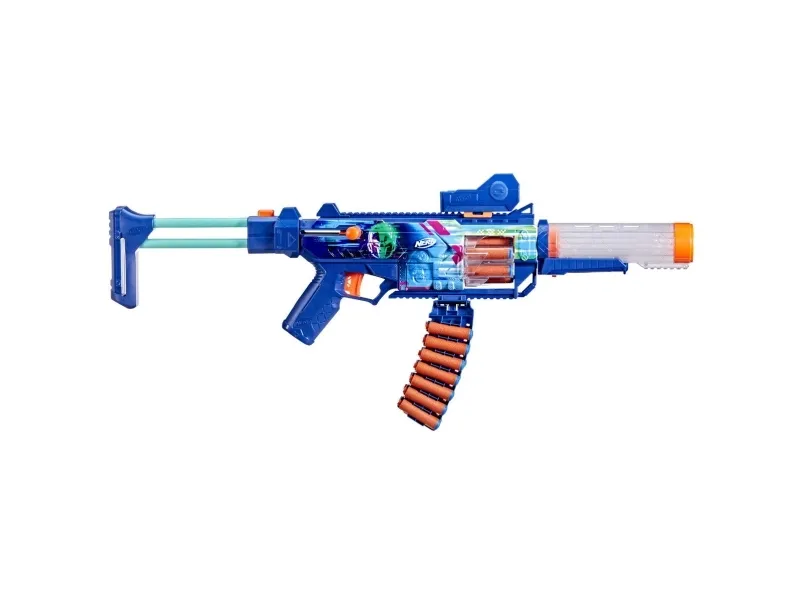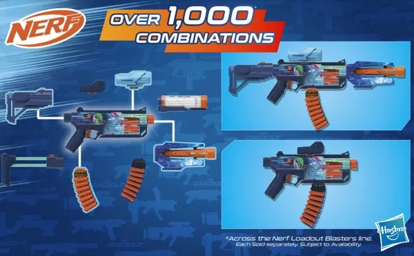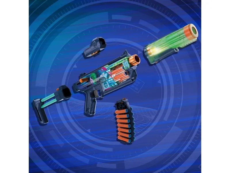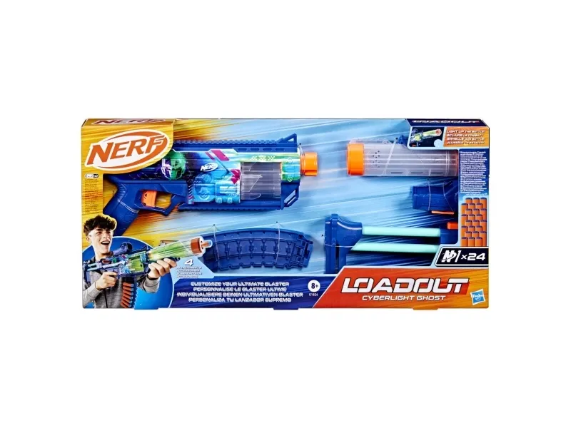 Bring videospil til live, og skab din ultimative blaster. Nerf Loadout-dartblastere har udskiftelige dele, der kan mikses og matches til mere end 1000 kombinationer! Nerf Loadout Cyberlight Ghost-blasteren med låsladning har indbyggede lyseffekter, der får løbet og tromlen til at lyse op! Den har en roterende tromle til 6 darts samt udstyrsdele i form af et kikkertsigte, et skæfte, et løb og et magasin til darts. Blasteren er udstyret med det legendariske Cyberlight Ghost-skin, der gør dig klar til alle de futuristiske kampe. Låsen kan sættes på i begge sider, så blasteren kan tilpasses højre- såvel som venstrehåndede spillere. Nerf Loadout Cyberlight Ghost-blasteren inkluderer 24 Nerf N1-darts designet til ekstrem præcision, hastighed og afstand. Opbyg din samling af Nerf Loadout-blastere for at få uendelige tilpasningsmuligheder (sælges separat; der tages forbehold for udsolgte varer). Nerf N1-darts kan kun bruges sammen med Nerf N1-dartblastere. Sikkerhedsbriller anbefales (medfølger ikke). NERF og HASBRO og alle relaterede varemærker og logoer er varemærker, der tilhører Hasbro, Inc.