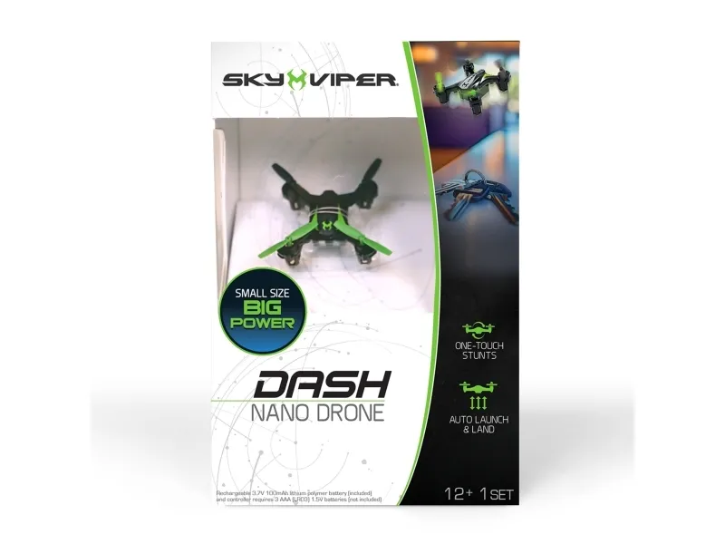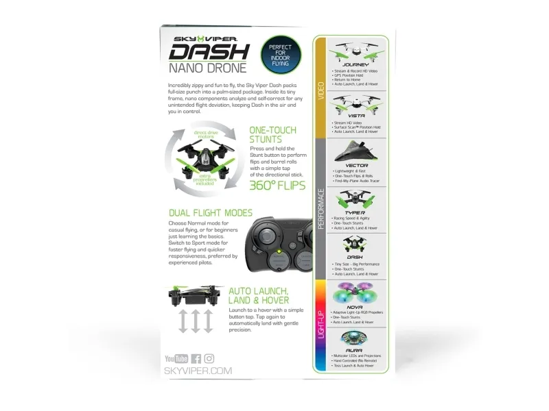 PERFEKT TIL FLYVNING INDENDØRS Utrolig hurtig og sjov at flyve – Sky Viper Nano Dash leverer kraften fra en fuldstørrelses drone i et design på størrelse med en hånd.