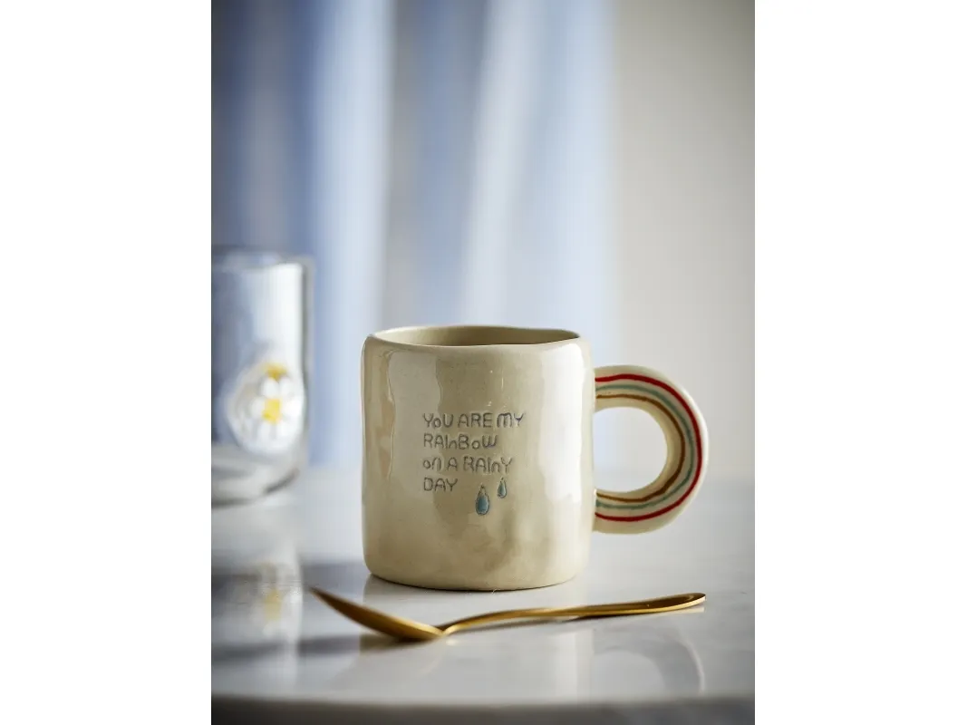 Cloudy Koppen fra Bloomingville MINI er en fin og charmerende kop med teksten "You are my rainbow on a rainy day" samt en regnbue som håndtag. Koppen vil uden tvivl sprede glæde og varme i hverdagen, og den er perfekt til en hyggelig kop te eller kaffe. Koppen kommer i en flot gaveæske af finer med et sødt print, der matcher koppen, hvilket gør den til en perfekt gaveidé.