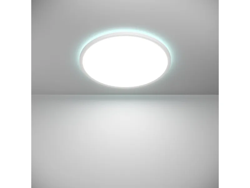 LED-loftlampen ROVITO-Z fra Smart Home-serien connect.z kendetegnes ved sit minimalistiske design. Med en højde på kun 3 cm og en diameter på 50 cm passer den runde loftslampe problemfrit ind i ethvert boligkoncept. Både kabinet og skærm er lavet af hvid plast. De integrerede LED’er giver dig fleksible lysmuligheder: Vælg mellem varmt hvidt, neutralt hvidt eller koldt hvidt lys samt et væld af RGB-lysfarver. Det øverste lys i lampen tilbyder individuelle RGB-indstillinger til indirekte belysning, mens det nederste lys kan indstilles fra varmt hvidt til koldt hvidt. Både det direkte og det indirekte lys kan tændes og slukkes separat samt dæmpes. Styringen af lampen sker via den gratis app (AwoX Home Control), som giver adskillige komfortfunktioner som dæmpning, timer og tilstedeværelsessimulering. Takket være Bluetooth og ZigBee 3.0 kan lampen også styres via kompatible stemmeassistenter som Amazon Alexa eller Google Assistant. Derudover er styring via en separat tilgængelig fjernbetjening mulig. ROVITO-Z LED-loftslampen fra connect.z smart home-serien udmærker sig ved sit minimalistiske design. Med en højde på kun 3 cm og en diameter på 50 cm passer den runde loftslampe perfekt ind i ethvert boligkoncept. Både huset og skærmen er lavet af hvid plast. De integrerede LED'er giver dig fleksible belysningsmuligheder: Vælg mellem varmt hvidt, neutralt hvidt eller koldt hvidt lys samt en række RGB-lysfarver. Det øverste lys på disse lys tilbyder individuelle RGB-indstillinger til indirekte belysning, mens det nederste lys kan justeres fra varm hvid til kold hvid. Både direkte og indirekte lys kan tændes og slukkes separat og dæmpes. Armaturet styres via den gratis app (AwoX Home Control), som muliggør adskillige komfortfunktioner såsom dæmpning, timer og tilstedeværelsessimulering. Takket være Bluetooth og ZigBee 3.0 kan lyset også styres via kompatible stemmeassistenter som Amazon Alexa eller Google Assistant. Derudover er det muligt at styre via en separat tilgængelig fjernbetjening.