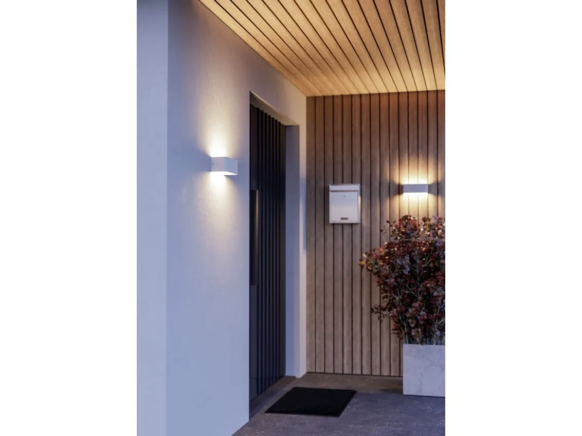 Udendørsvæglampen "SANIA-Z" i hvid imponerer med sin CCT- og RGB-funktion, som muliggør en fleksibel justering af lysfarven fra varm hvid til kold hvid samt valg fra et bredt udvalg af RGB-farver. Lampen kan nemt styres via vores app samt vores fjernbetjening, så du kan indstille belysningen helt efter dit behov og humør.