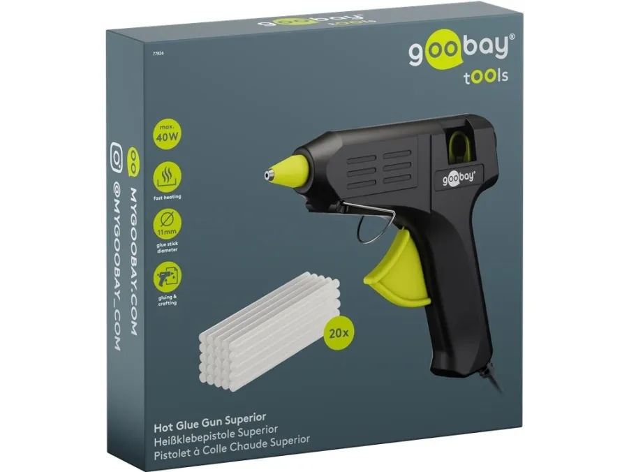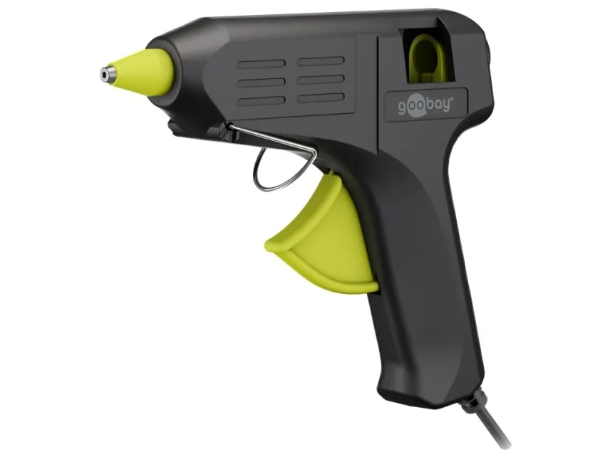 til varmlimsticks med 11 mm diameter Klæber hurtigt og pålideligt: Kompakt limpistol til alle limningsopgaver ved hobby, dekoration eller reparation Enkel dosering og præcis påføring: Den mekaniske fremføring af limpistolen gør det muligt at påføre den flydende lim jævnt og doseret (16 g/min.) Alsidig anvendelse: Varmlimstifterne er velegnede til mange forskellige materialer, f.eks. pap, keramik, træ, metal, læder, akryl og glas Praktisk udklappelig stativ: Den opvarmede limpistol står fast og sikkert på det udklappelige stativ, så der ikke opstår brandpletter på bordet, arbejdsmåtten eller underlaget Reduceret risiko for forbrænding: Takket være varmebeskyttelsesspidsen stikker den opvarmede metaldyse kun minimalt ud af pistolen for at sikre øget sikkerhed under brug Strømforsyning via netkabel med eurostik, spændingsområde 110-240 V (AC), kabellængde 1 m