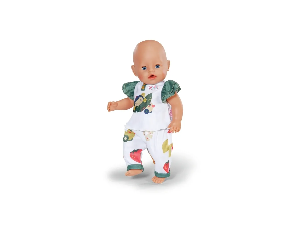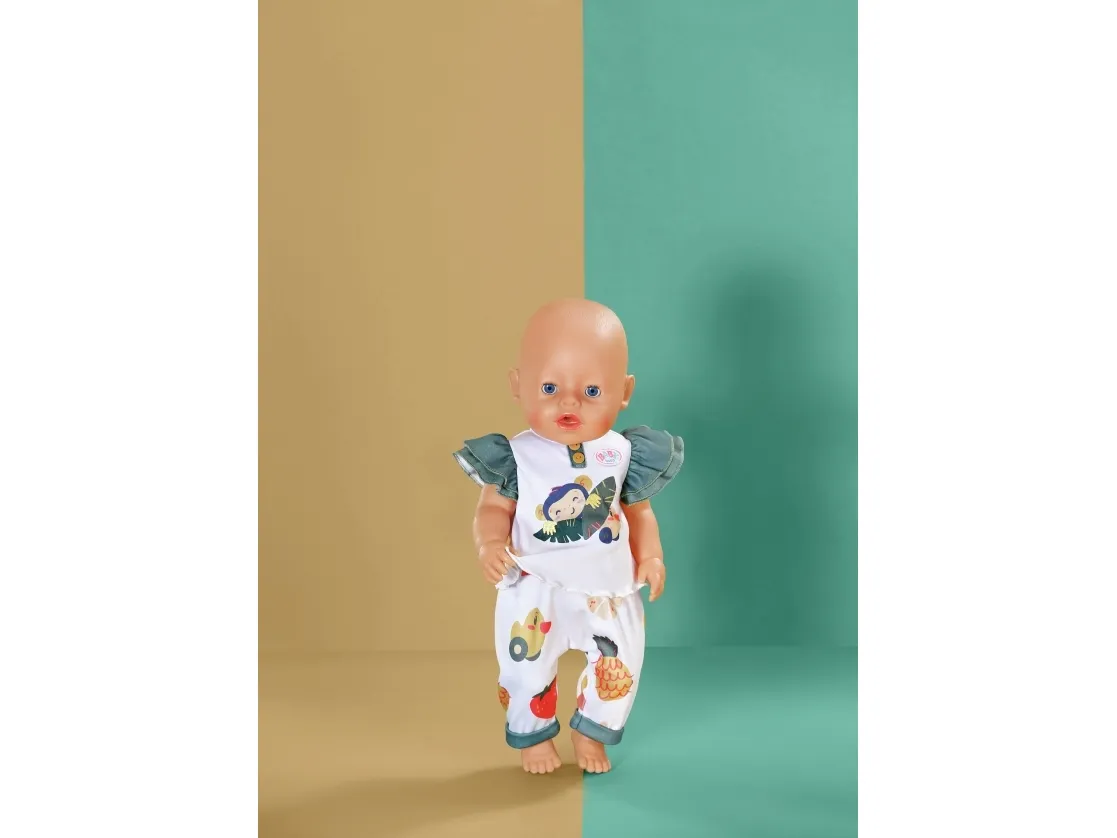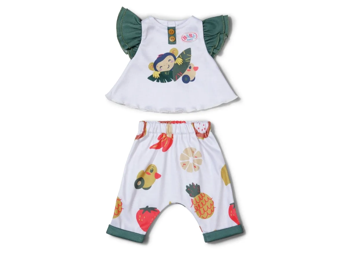 Det er her, du virkelig bliver ramt af junglefeber: På den sjove bluse med flæseærmer og knaplukning i halsen er der en lille abe, som griner mellem to bananblade, mens forskellige frugter er afbildet på de matchende bukser. Tilbehør af høj kvalitet til BABY born. Giver mulighed for endnu mere afvekslende og langvarig, sjov leg. Fra 3 år. Inkluderer: BABY born outfit abe 43 cm bestående af bluse og bukser