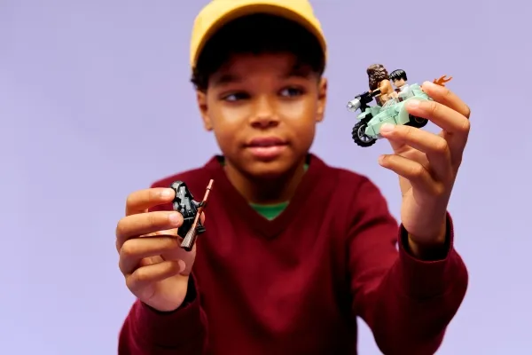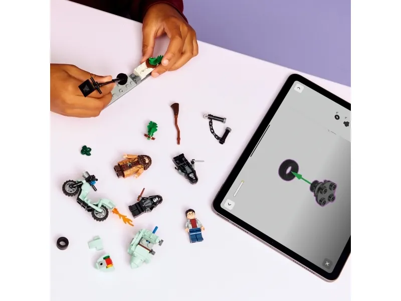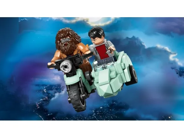MOTORCYKELMODEL MED SIDEVOGN – Sæt Rubeus Hagrid™ på den første LEGO® model i minifigurskala af hans flyvende motorcykel med Harry Potter™ i sidevognen