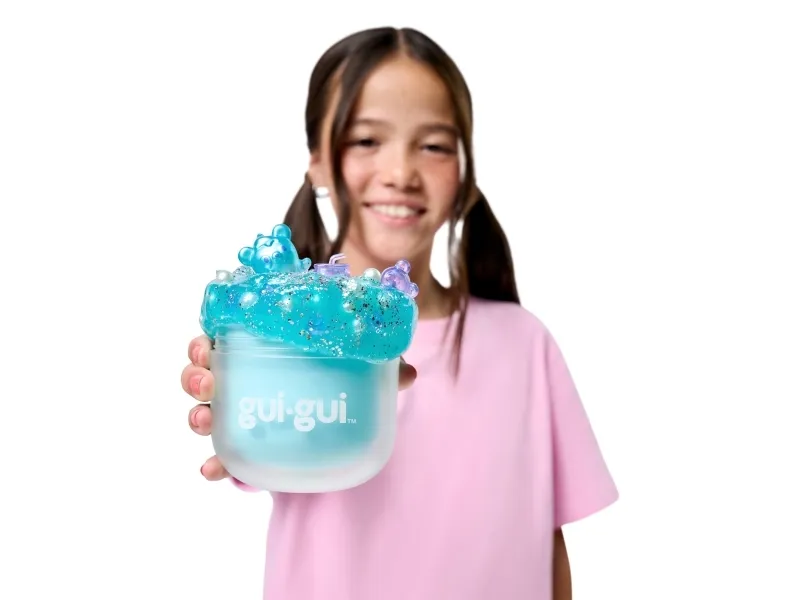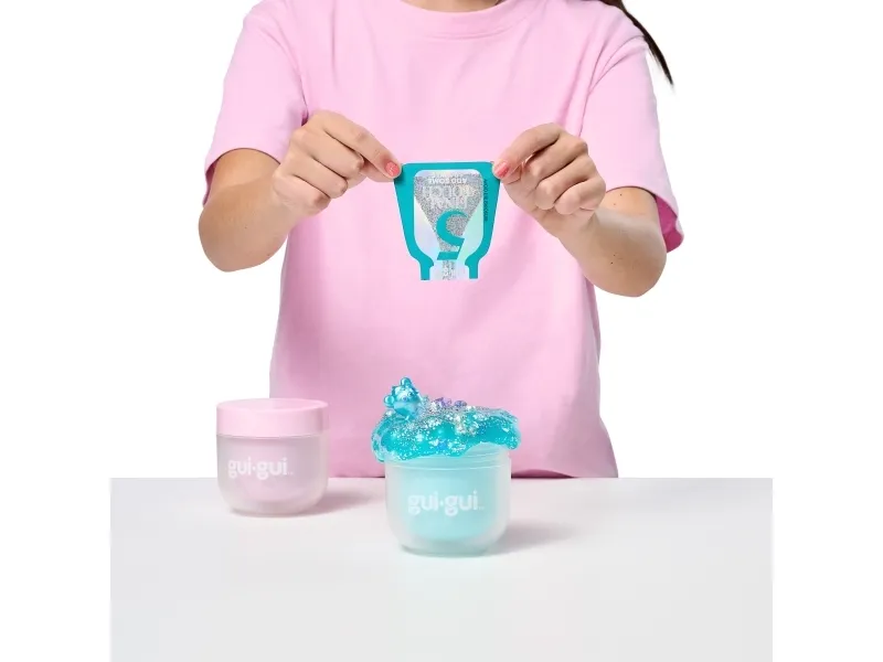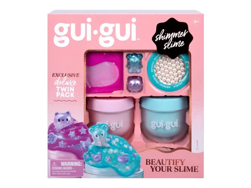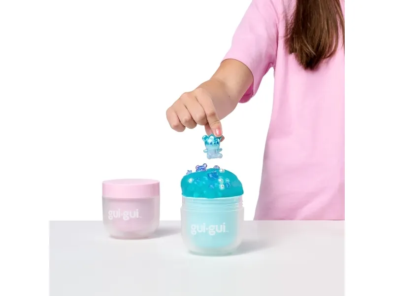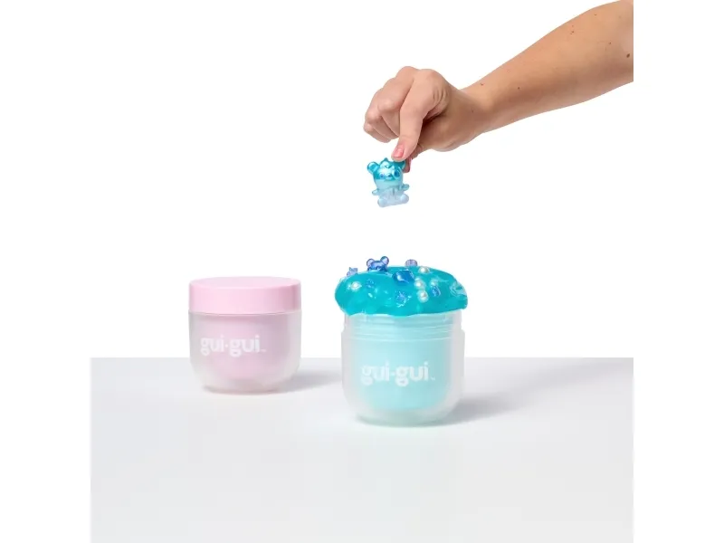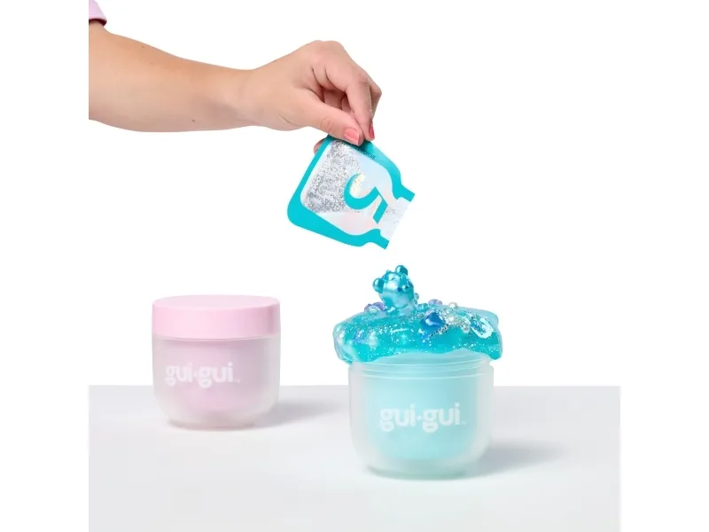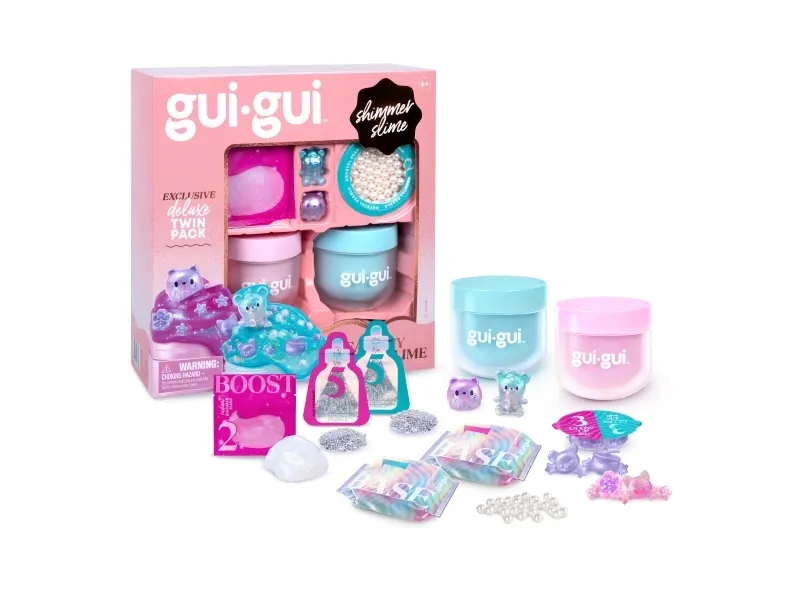 GUI GUI Deluxe 2 stk. er et deluxe-sæt med to forskellige slimes, hver med sin egen farve, duft og tekstur – som f.eks. Gloss, Clear, Butter eller Cloud. Sættet inkluderer overraskelser som glimmer, charms og søde samlerfigurer, der gør unboxing-oplevelsen ekstra sjov. Perfekt til børn fra 6 år.