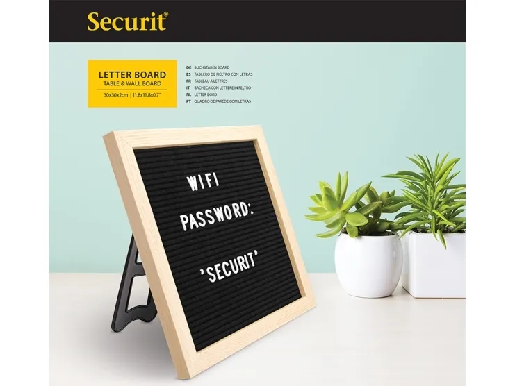 Har du noget at sige? Vis din unikke besked eller menu med denne Securit® bogstavtavle. Tilfører en charmerende retro stil til din virksomhed eller dit hjem. Den rustikke solide træramme med filtoverflade gør den perfekt til at vise menuer, prislister, åbningstider, specielle tilbud, en sjov besked og meget mere. 176 akrylbogstaver, tal og ikoner er inkluderet samt monteringsbeslag og bordstativ Fås i forskellige størrelser.