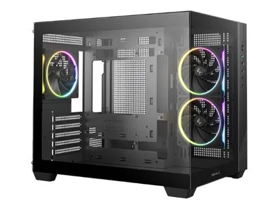 Support bag-forbindelsesmotherboard, top panel støvfilter, støvfilter i bunden, cable management system (46 mm clearance), dubbelkammerdesign, 2-delt panoramisk glas, ARGB-blæsere