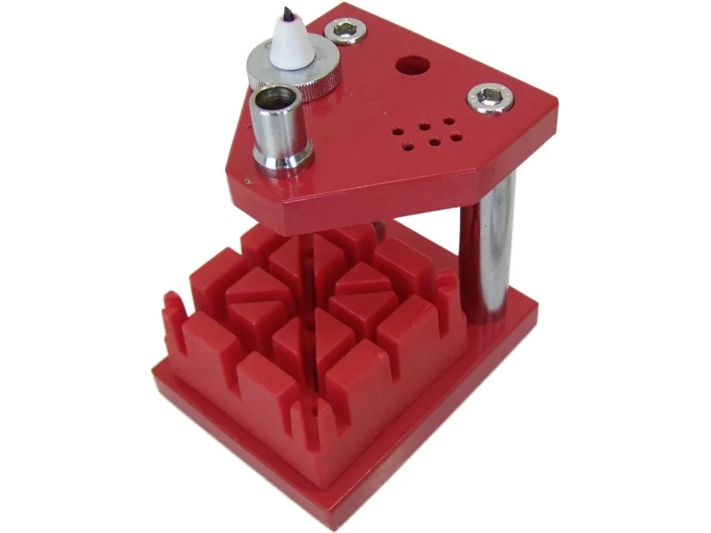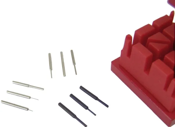 Stiftudtrykker i værkstedsdesign Tapeholder af plastik med 8 slidser · 6 punsler på 0,3-1,9 mm · Klinger til skruetrækkere 0,5/1 og 1,5 mm. Til reparation eller afkortning af urarmbånd af metal. En præcise håndtering af udtrykkeren og den 60 x 75 mm store flade gør arbejdet sikkert for dig. Til reparation eller afkortning af urarmbånd af metal.