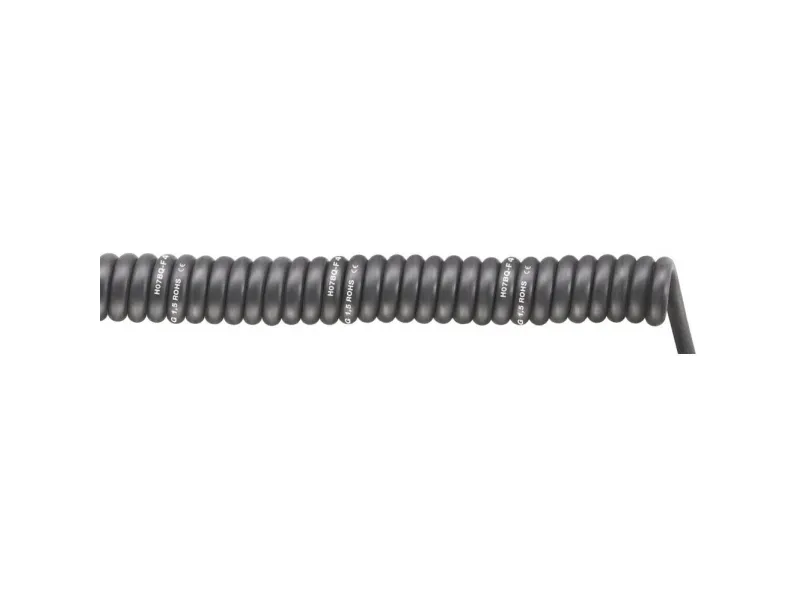 Den hak duktilt PUR spiral kabel med høj genoprette kræfter. Forholdet mellem ekspansion er 3: 1 , dvs. et spiralkabel med en lukket længde på 500 mm kan udvides til tre gange længden 1500 mm. De udtrukne ender er hver lige snit og 200 mm (ende 1) eller 600 mm (ende 2) lange. UV-bestandig. Til krævende applikationer