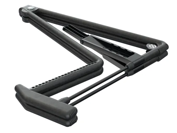 Worldwide proven guitar stand. The instrument is particularly well cared for thanks to the elaborate new rubber structure. With the innovative adjustable cross bar, guitars of different sizes or even other instruments such as a cello or French horn can be placed on the stand. For storage and transport the stand folds flat. In addition, we provide a practical transport lock. An additional feature includes integrated guitar pick holders. Heli 2 is available in black, red, blue and cork.