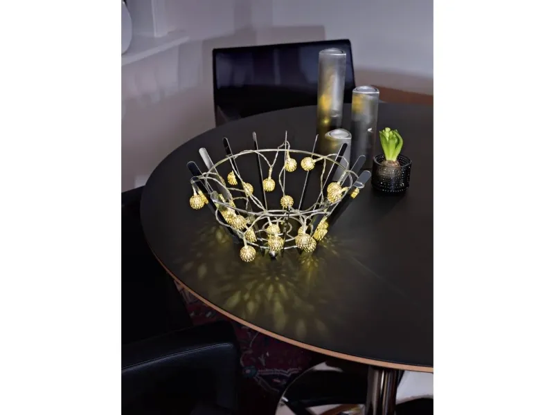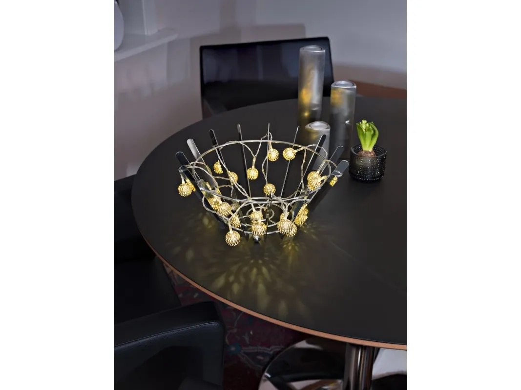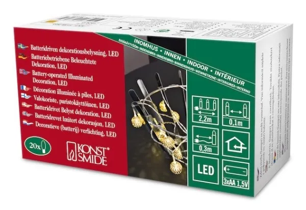 LED-dekorationslyskæde, små guldfarvede metalbolde Glæd dig over et imponerende dekorationshøjdepunkt. Som små smykker lyser de fint forarbejdede metalkugler i høj kvalitet i mørket og fortryller beskueren med stråler i øjet og et smil på læberne. Om det er på det festdækkede bord, i et glasfad eller i en beholder, denne dekorationslyskæde fra Konstsmide tiltrækker alle blikke. Firmaet Konstsmide har i mere end 40 år specialiseret sig i at lave førsteklasses lysdekorationer til indendørs og udendørs brug og har siden 1999 været toneangivende inden for miljøvenlige, holdbare og sikre LED-løsninger.
