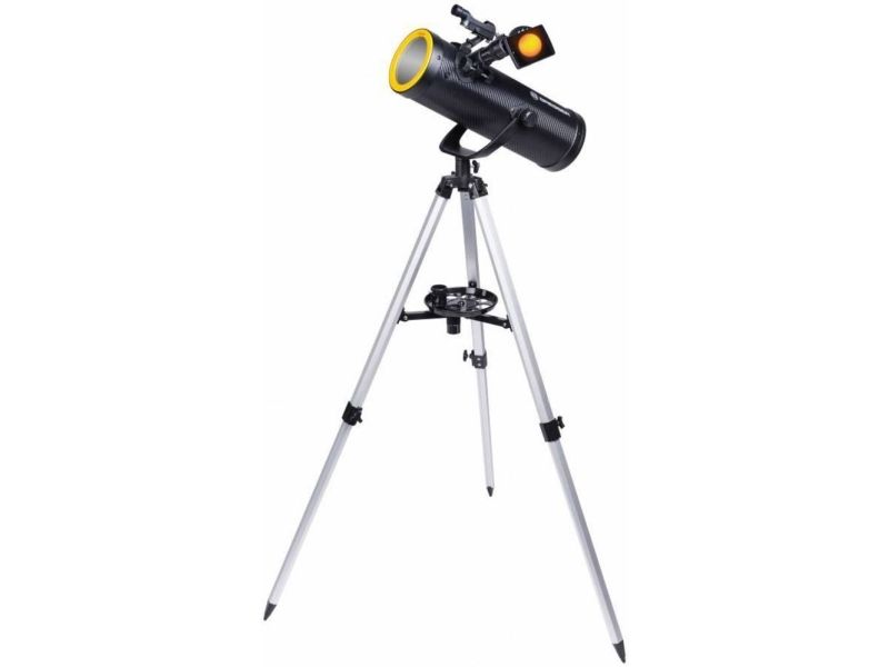 Sol-spejlteleskop Solarix 114/500 Newton spejl-system · til nat- og solobservation · fuldt forædlet · smartphone-kameraadapter · højdejusterbart aluminium-trebensstativ med tilbehørshylde · egnet til sol-, himmel- og jordobservation · certificeret specialfilter til risikofri solobservation · azikammutal montering · hurtig opbygning - enkel håndtering Lad dig fascinere af en enestående oplevelse af solobservation, men også stjernehimlen om natten! Med Solarix 76/350 præsenterer vi dig for det første Newton-teleskop, som du kan bruge til at holde øje med solen. Og det med en certificeret kvalitet og til en sensationel pris! Det har aldrig været så nemt, billigt og frem for alt sikkert for den brede befolkning at se både nattehimlen og solen med et teleskop. Solfilteret, der er specielt udviklet til dette teleskop, er muligt. Specialfolien beskytter øjet pålideligt mod infrarøde, ultraviolette og synlige lys, når du observerer solen. Man lader kun solens dæmpede lys, som ikke er skadelige for øjnene, udstå og fremstår som et vidunderligt billede i okularet. Og det bedste: Med den medfølgende smartphone-holder kan du med din mobiltelefon nemt tage billeder af observationsobjekter - forstørrer og i farver som med et tele-objektiv! Naturligvis har Solarix 76/350 også alle optiske forudsætninger for astronomiske iagttagelser på nattehimlen. Det medfølgende tilbehør indeholder alt til øjeblikkelig observationsstart. Newton-reflektoren er hurtigt opbygget og indrettet med de omfattende betjeningsvejledning.