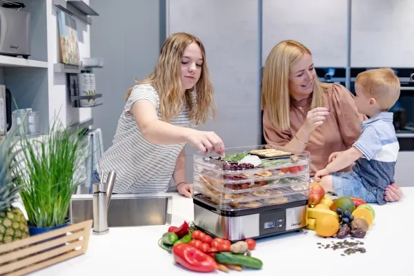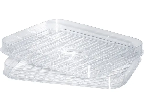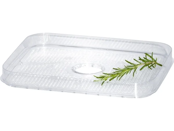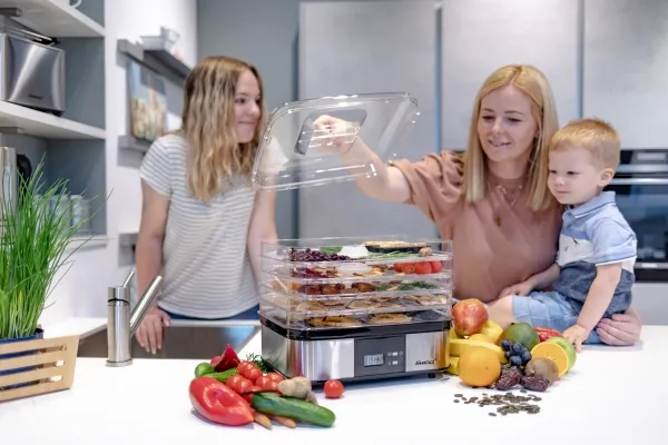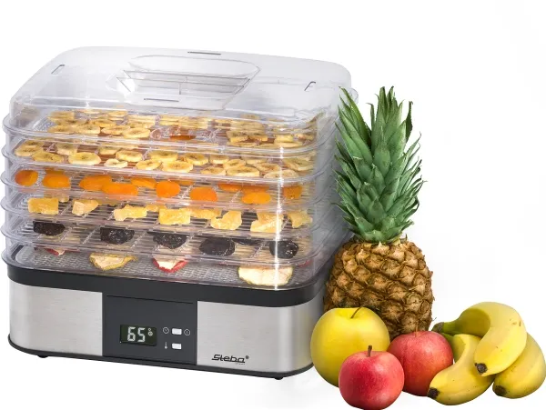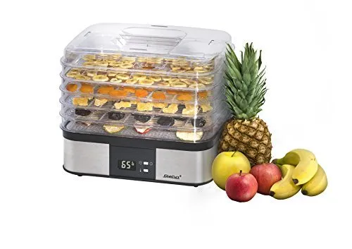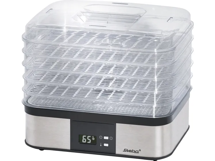 - For drying and preserving fruit, vegetable and herbs\n- Electronic temperature control from 40 to 70 ° C\n- Electronic timer (1 - 36h)\n- Durable motor with fan blades\n- 5 stackable plastic trays, so for single use\n- Incl. mat for herbs\n- Transparent cover\n- Display\n- Large drying surface with 5 x 32 x 25 cm