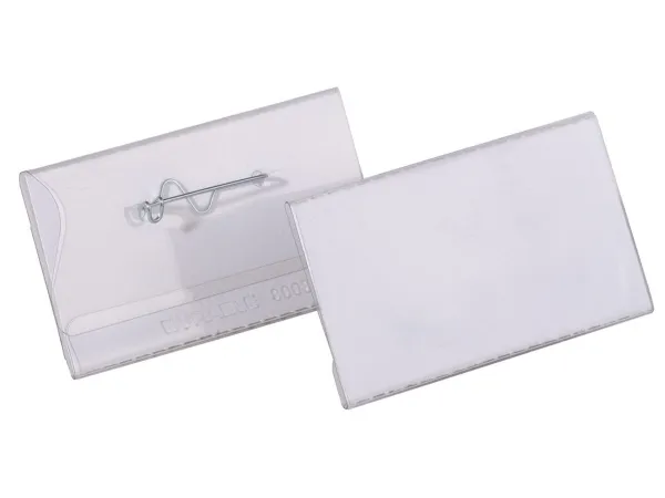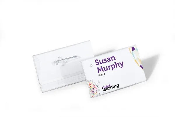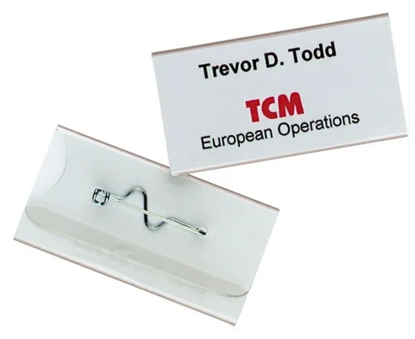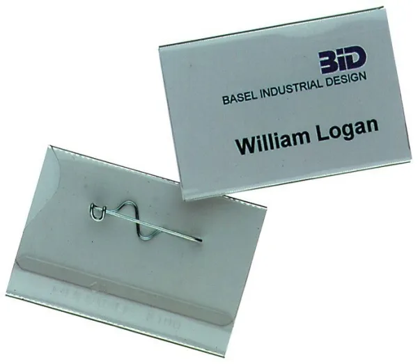 glass clear transparent plastic name badge thumb slot on the reverse to enable easy replacement of inserts curved pin with shielded tip (avoids injury) ensures a secure hold on clothing available in 5 different sizes badge size 40x75mm - refers to size of insert card (HXW)