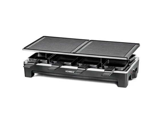 This high quality raclette made by ROMMELSBACHER guarantees even more culinary variety when raclette-grilling. You can freely combine the different turnover grill plates, thus you are flexible in choosing and combining the grilling surfaces. Whether on both of the high quality coated turnover grill plates (one side corrugated, the other one smooth) or on natural stone - there is an excellent selection to suit all tastes. On the granite plate you can grill directly on the stone. This material is scratch- and cut-resistant and provides outstanding grill result, no matter whether for meat, fish or vegetables. The circumferential juice groove collects grease or liquids and thus allows for low fat grilling. The both die-cast aluminum grills can be used on both sides. Whether grilling with the typical grilling marks or rather in Teppanyaki style on a smooth plate - everything is possible. The 8 non-stick coated pans can be used as raclette pans for cheese or for gratinating delicious snacks and side-dishes to suit your own taste. A popular and versatile raclette version for all year long grill fun at table.\n\n- three combination plates for a flexible composition of grill surfaces: 2 x turnover grill plates made of die-cast aluminum (one side corrugated, one side smooth), with high quality Xylan plus non-stick coating; 1 x natural stone grill plate made of granite, scratch and cut resistant, with circumferential juice groove, ideal for low-fat grilling\n- casing made of high quality plastic, with stainless steel elements\n- 8 non-stick coated pans with heat-insulated handle\n- 8 spatula made of plastic\n- temperature controlled steplessly by thermostat\n- pilot lamp