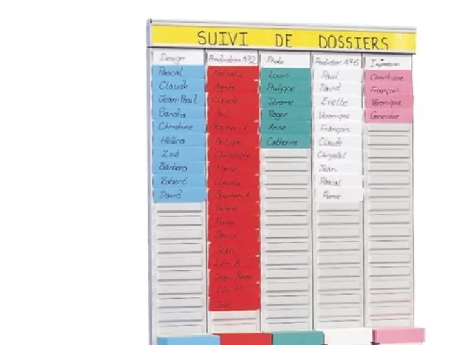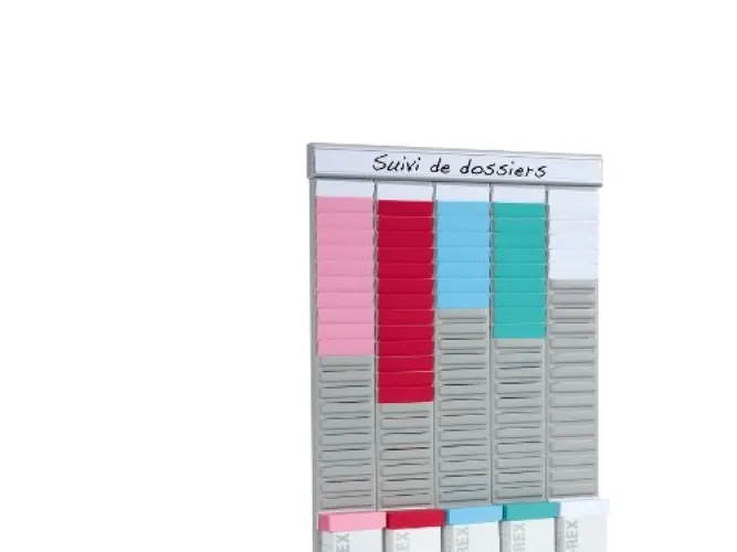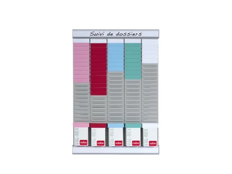 The kit includes: 5 panels with 24 slots for size 2 T-Cards, 2 aluminium rails with title strips, 5 boxes of 100 size 2 T-Cards (assorted colours), wall mounting kit. Dimensions: H 48 x L 32 cm