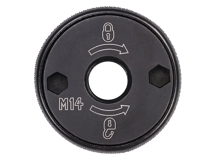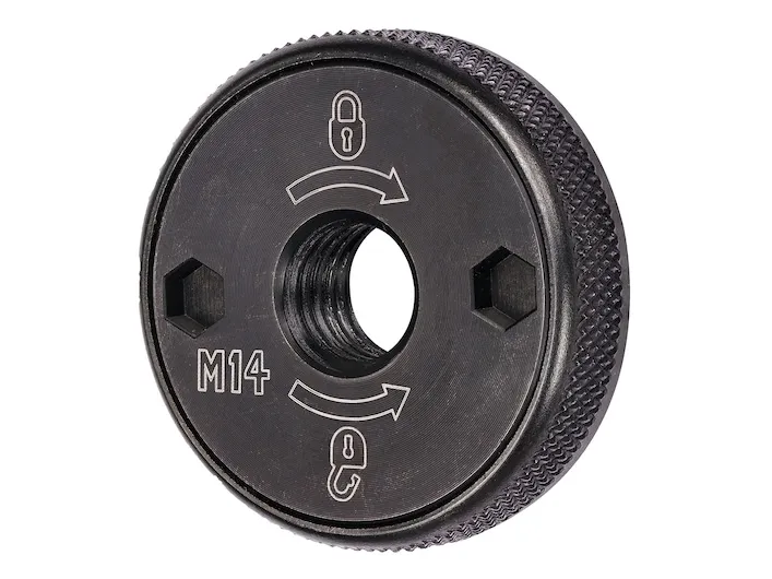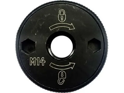 Hurtigspændemøtrik M14 Passer til alle vinkelslibere med M14 drev spindel. Udskiftning af skiver sker på sekunder, intet værktøj er påkrævet. Ved eventuellem efter behov også med endehulnøgle at åbne. Tykkelse 12mm.
