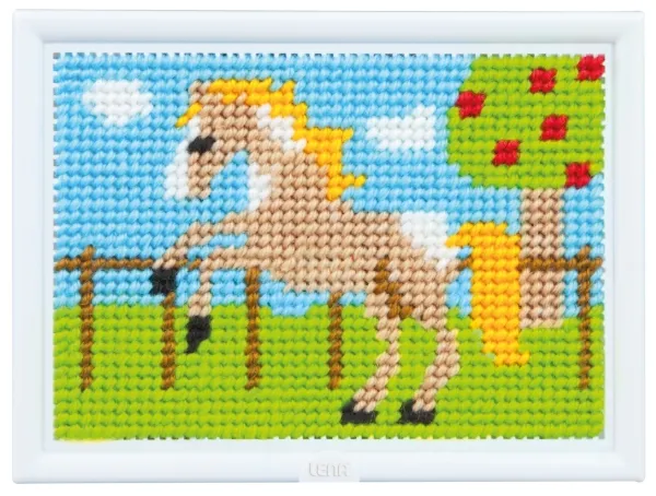 LENA® broderihest, børnevenligst motivbroderi. Brug den stumpe nål til at tråde tråden gennem stingene på det fortrykte billede. Sættet indeholder et fortrykt plastik broderiret i høj kvalitet med ramme (ca. 17 x 12 cm) og hængende enhed, en stump metalnål og farvekoordineret uld. Motiv: hest. Advarsel! Ikke egnet for børn under tre år, på grund af faren for kvælning forårsaget af små dele. Kort om Lena Kreativt legetøj Lena kreative legetøj er udviklet og produceret i Europa af Tyske Simm Spielwaren. Alle produkterne er produceret i høj kvalitet og sælges med 3 års garanti, og opfylder som minimum alle EU's regler indenfor produkter til børn.
