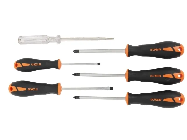 1 x PH2 x 100 mm anvendes til Phillips-skruer 1 x PZ1 x 100 mm anvendes til Pozidrive-skruer 1 x PZ2 x 100 mm anvendes til Pozidrive-skruer 1 x LK3 x 75 mm anvendes til for lige kærv-skruer 1 x LK5,5 x 100 mm anvendes til for lige kærv-skruer 1 x Polsøger 190 mm anvendes f.eks. til at konstatere vekselspændinger