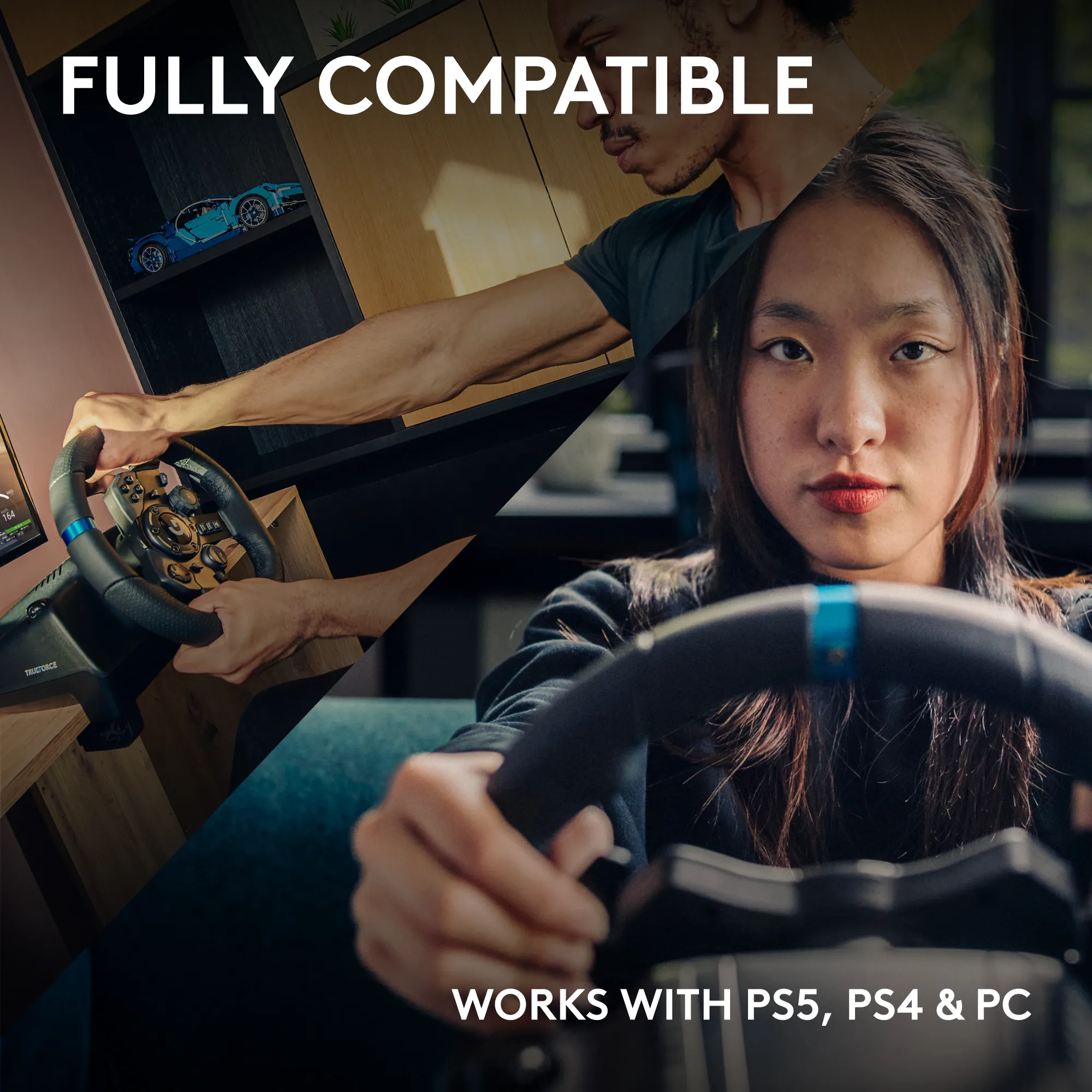 Eksklusiv TRUEFORCE-feedbackteknologi reagerer direkte på hændelserne i spillet og sikrer en hidtil uset realisme. Fremstillet af kvalitetsmaterialer, herunder gearskiftere af aluminium, rat beklædt med håndsyet læder og trykfølsomt bremsesystem.