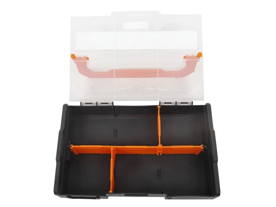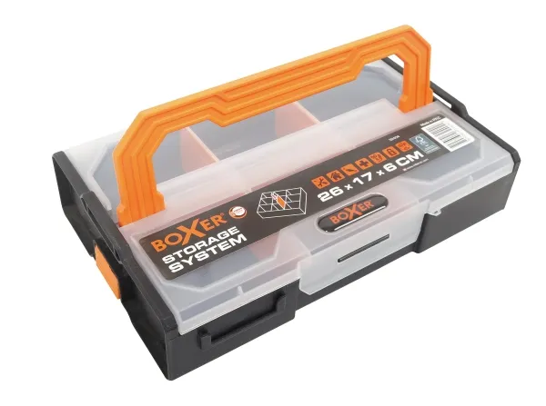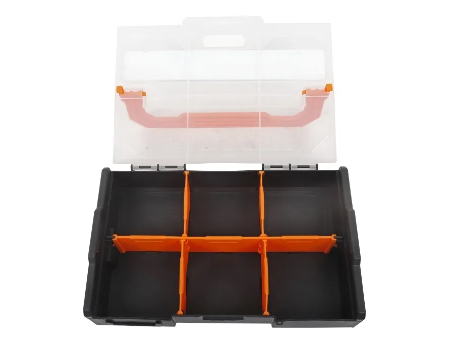 Antal rum: 6 Længde: 26 cm Bredde: 16,8 cm Højde: 6 cm Håndtag Stabelbar Justerbare skillerum til personlig indretning Materiale: PP Farve: sort / orange / transparent