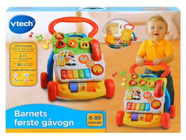Fra babyskridt til store skridt hjælper Barnets første gåvogn fra Vtech din baby med at komme fra kravlen til at gå. Med en masse sjove aktiviteter vil barnet have masser af sjov mens det udvikler sig igennem legen. Aktivitetspanelet kan nemt tages af og bruges på gulvet eller bruges mens dit barn suser afsted med gåvognen på farten. Dreje hjul, piano nøgler, formelementer, telefon og meget mere udfordre til endeløs leg og hjælper dit barn med at udvikle sin finmotorik samtidig med barnet lærer om farver, former, dyr, musik og mere. Over 70 syng-med sange, musik, lydeffekter og sjove sætninger. Bruger 2 x AA batterier. Alder 9m+.