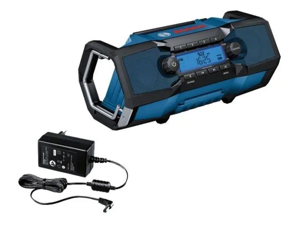 Bosch Radio GPB 18 V-2 C. Ekstrem fleksibilitet for et behageligt arbejde: Gengivelse via Bluetooth®, FM og AUX Giver intuitiv betjening og hurtig opsætning i kombination med greb og kroge til lodret og vandret opstilling Enestående stereolyd takket være muligheden for at forbinde to radioer med en smartphone GPB 18 V-2 Professional er den robuste musikkilde til stærk lyd på ru byggepladser. Denne robuste radio er kompatibel med Bluetooth®, FM og AUX og giver altid den rigtige lyd for et behageligt arbejde. Den kan drives med et 18 V-batteri eller med strøm fra lysnettet og giver en intuitiv betjening, hurtig konfiguration, USB-lademulighed og IP 54-beskyttelse. Radioen kan opstilles lodret eller vandret og har både et håndtag og en krog til nem transport og praktisk opbevaring. Disse fordele understøttes desuden af et kompakt design. Takket være sin funktion til at forbinde to radioer med en smartphone kan brugeren nyde en unik stereolyd. De to højttalere i GPB 18 V-2 Professional med i alt 15 watt giver en fremragende lyd, mens de ekstra passive membraner sørger for en bedre basgengivelse. Dette apparat er særligt velegnet til radiomodtagelse og afspilning af musik via smartphones.