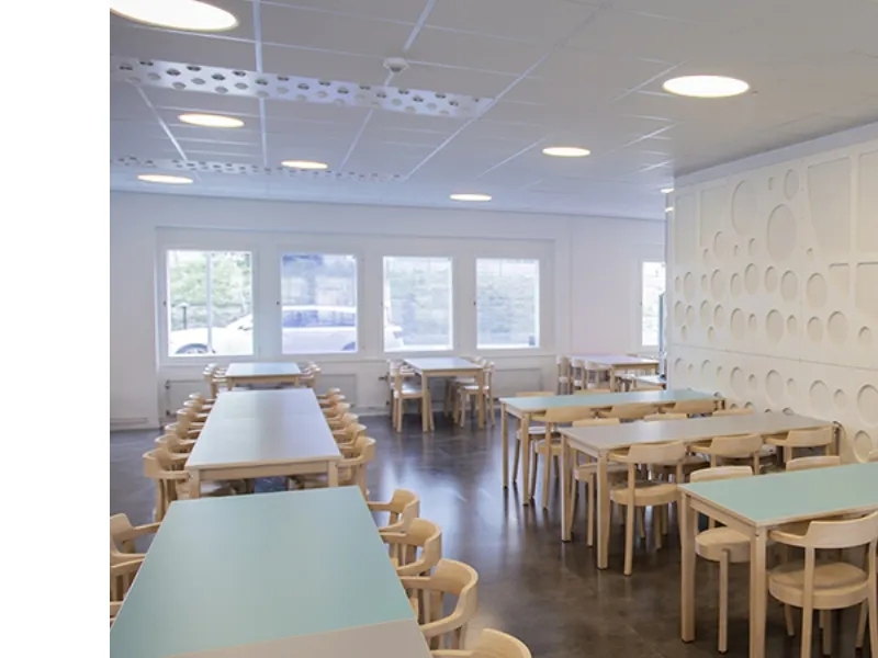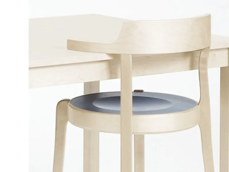 Stol Ruth i klarlakeret massiv birk kan både stables og hænges op. En populær stol til bl.a. kantine og grupperum. Lyddæmpende absorbent under sædet.
