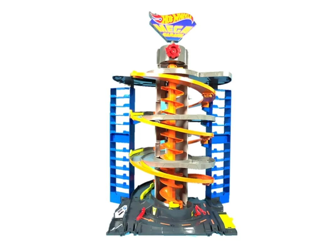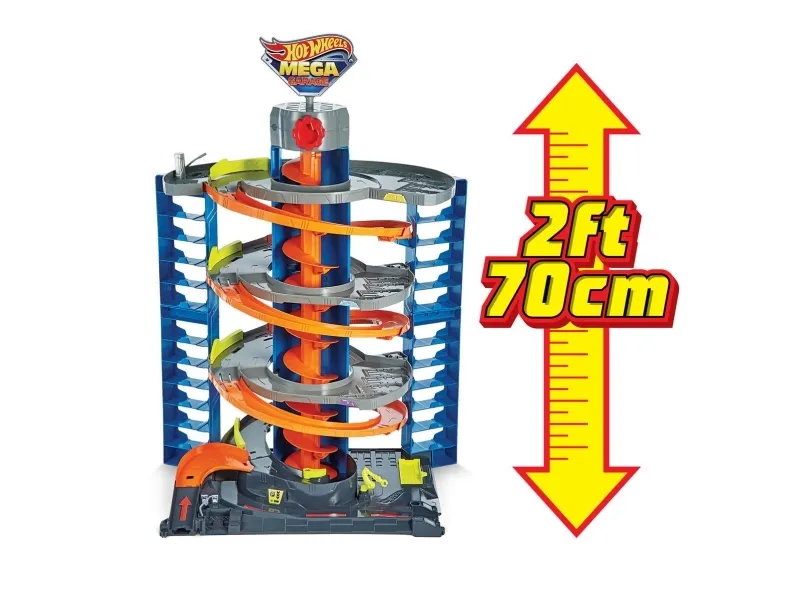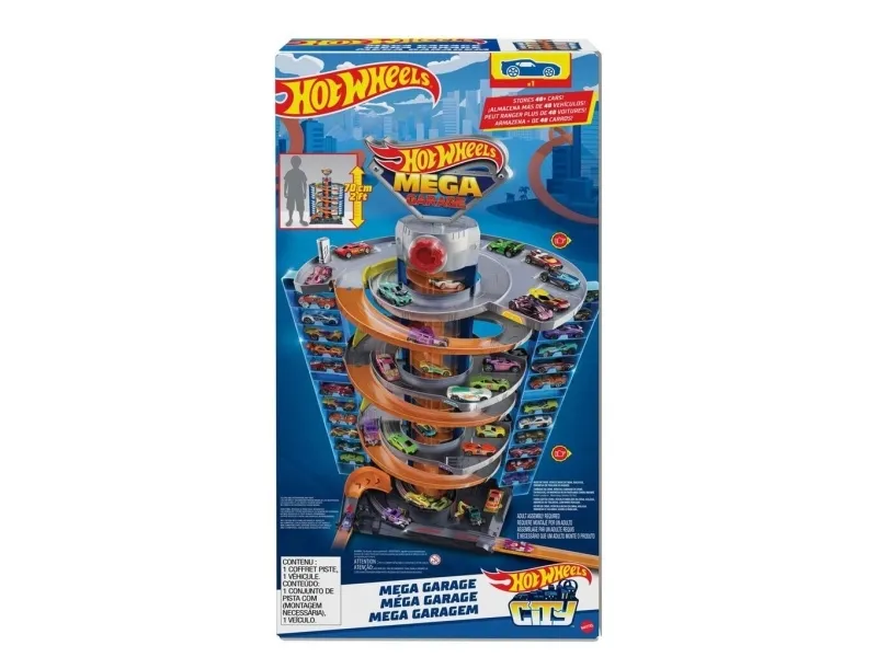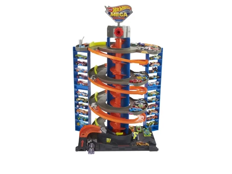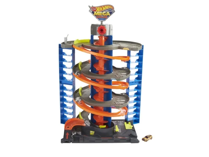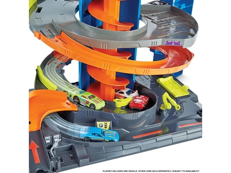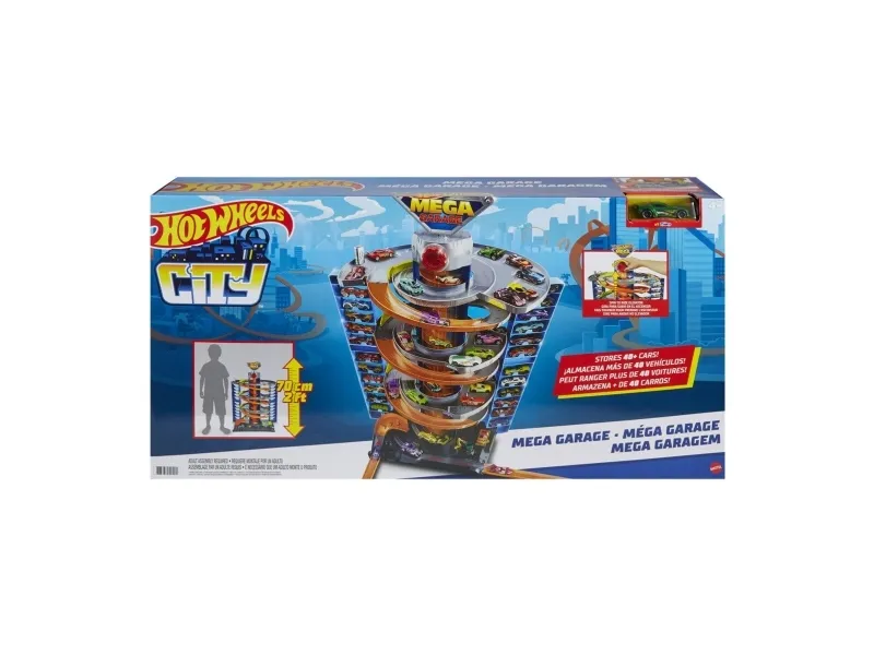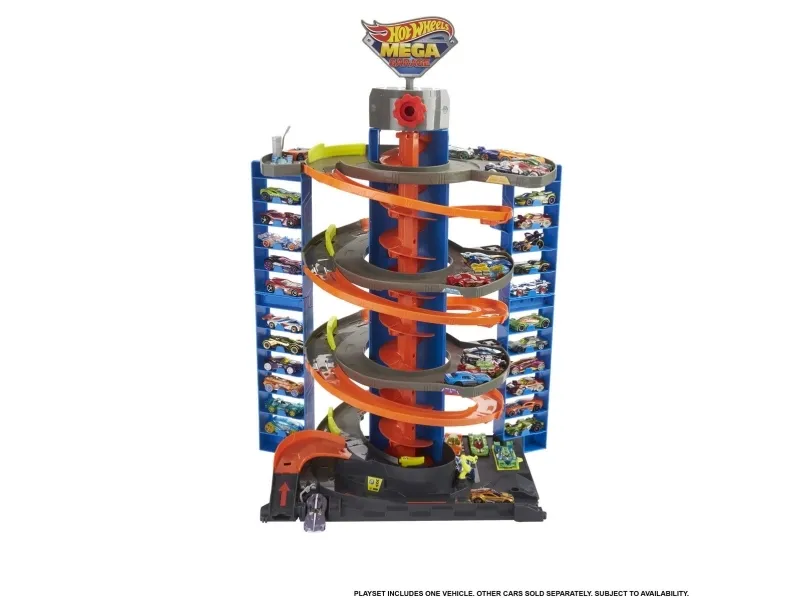 Hot Wheels City Megaparkeringshus-legesættet er fire etager fyldt med parkeringssejhed. Det kommer med en bil i skala 1:64, men der er plads til næsten 60 flere (ekstra biler sælges separat.) I midten er der en spiralformet elevator, som transporterer bilerne rundt imellem de forskellige etager og sætter dem ud på en bane. Børnene styrer den med et håndtag og bestemmer, om bilerne skal ud på eventyr, eller blot skal holde på en parkeringsplads til synlig opbevaring. Flere forbindelsespunkter gør det muligt at forbinde legesættet med andre Hot Wheels-sæt (sælges separat), og der er yderligere fire punkter, hvor orange banestykker kan sættes på for at skabe de ultimative stunts og byggerier. En Hot Wheels-bil i skala 1:64 følger med, så legen kan starte, så snart æsken åbnes. Farver og mønstre kan variere.