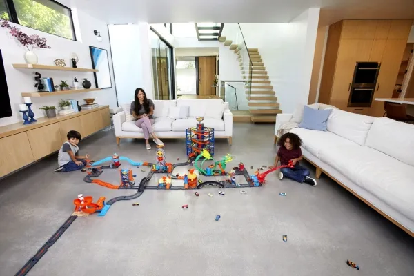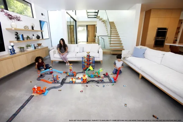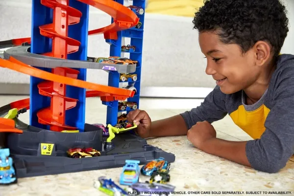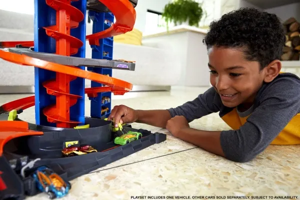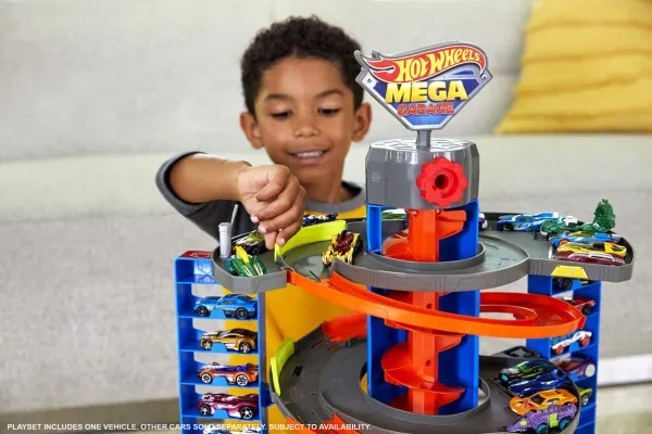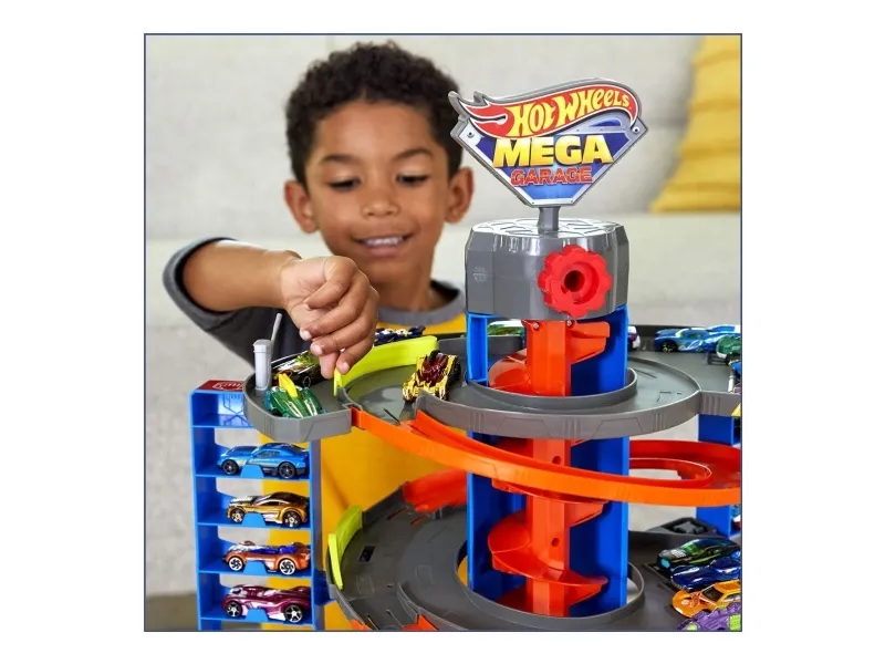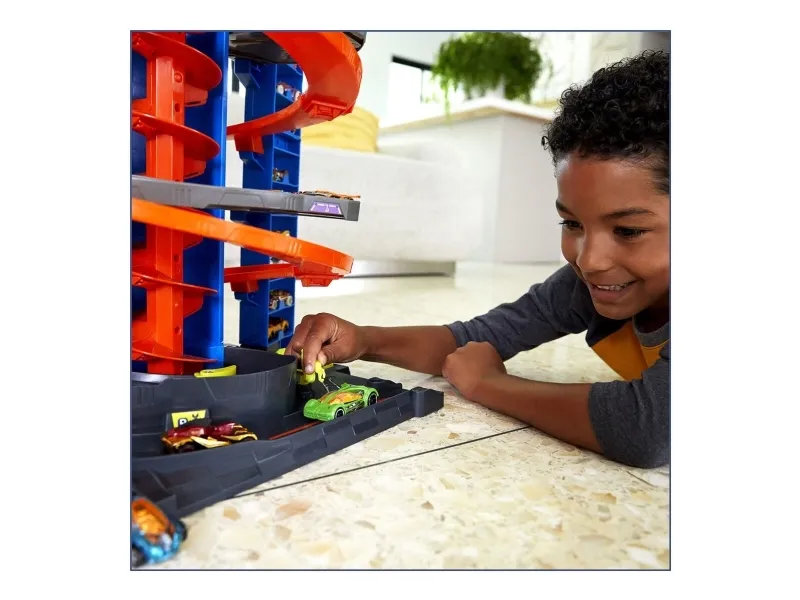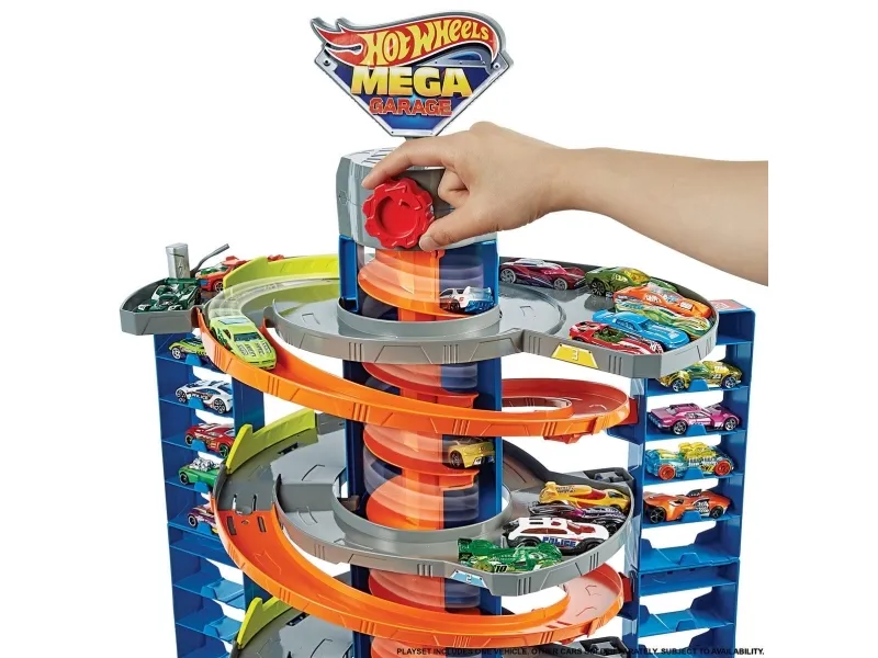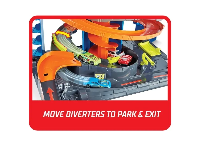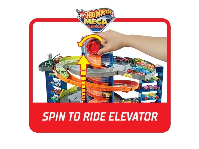 Hot Wheels City Megaparkeringshus-legesættet er fire etager fyldt med parkeringssejhed. Det kommer med en bil i skala 1:64, men der er plads til næsten 60 flere (ekstra biler sælges separat.) I midten er der en spiralformet elevator, som transporterer bilerne rundt imellem de forskellige etager og sætter dem ud på en bane. Børnene styrer den med et håndtag og bestemmer, om bilerne skal ud på eventyr, eller blot skal holde på en parkeringsplads til synlig opbevaring. Flere forbindelsespunkter gør det muligt at forbinde legesættet med andre Hot Wheels-sæt (sælges separat), og der er yderligere fire punkter, hvor orange banestykker kan sættes på for at skabe de ultimative stunts og byggerier. En Hot Wheels-bil i skala 1:64 følger med, så legen kan starte, så snart æsken åbnes. Farver og mønstre kan variere.