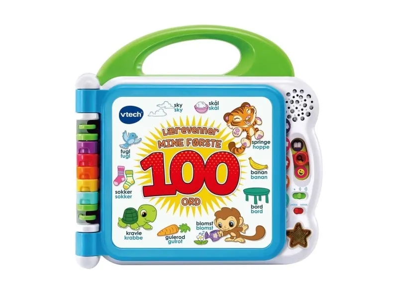 Åben Vtechs 'ordbog' og udforsk barnets 100 første ord. Gulerod, bord og banan. Alle ordene er lette, børnevenlige og skabt til at sætte gang i barnets audiovisuelle sanser. Ved at trykke på den gule stjerne afspilles lærerige sange. Dyk ned i de farverige sider og få læst hvert ord højt, ved at trykke på det.