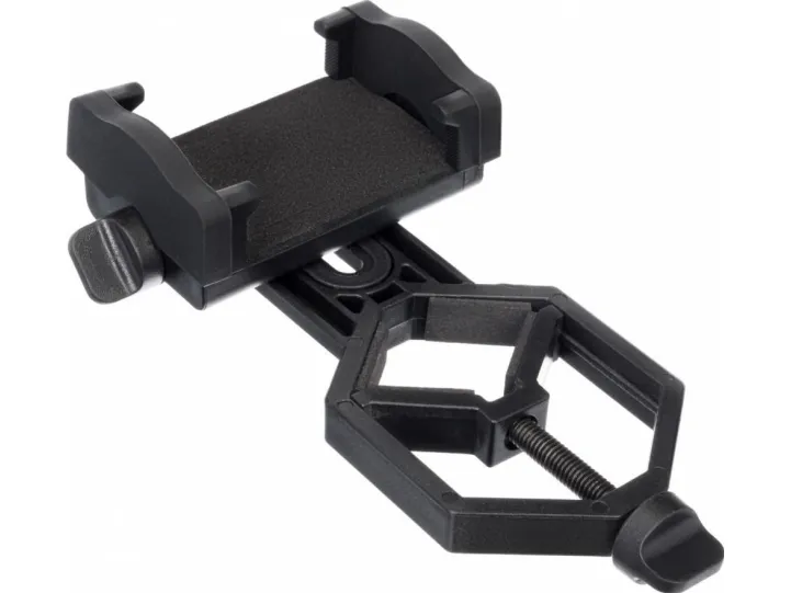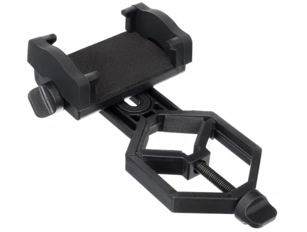 The adapter is adjustable, so it fits various smartphones and optical equipment. The diameter of the optical device eyepiece should be from 25mm to 48mm, and the width of the smartphone should be from 52mm to 100mm. The adapter is made of plastic.