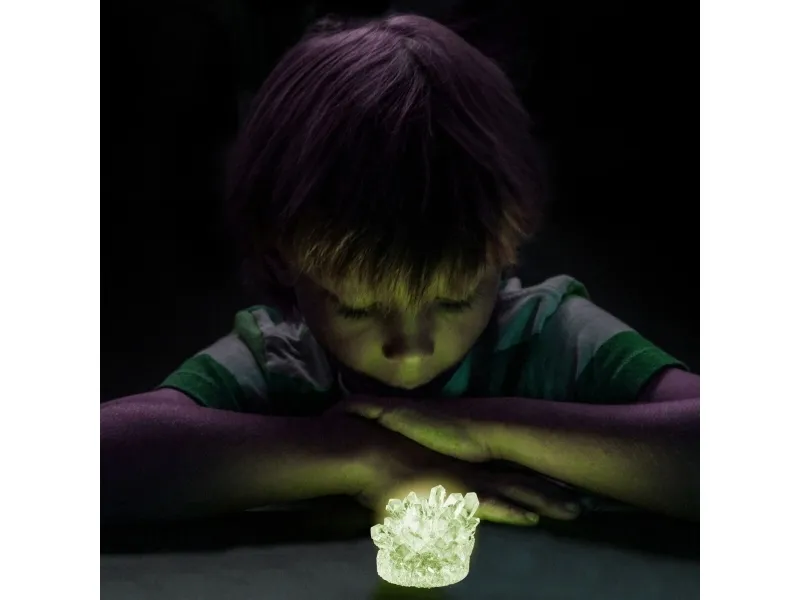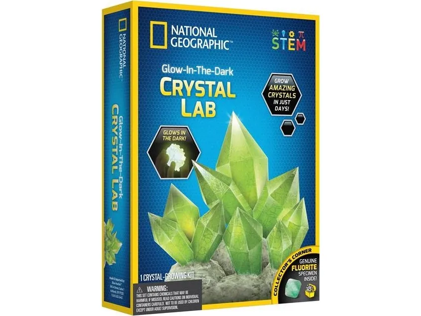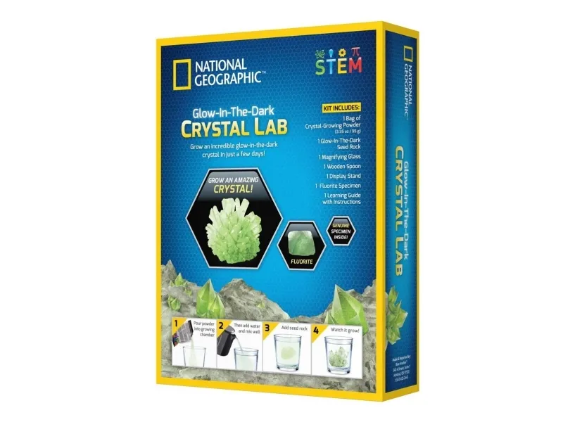 National Geographic's Glow-in-the-Dark Crystal Lab er et fascinerende og sjovt videnskabeligt eksperiment. Børn kan gro en krystal på bare et par dage og så forbløffet se på, når den lyser i mørket! Den medfølgende læringsvejledning er fyldt med interessante fakta om krystaller og den indeholder endda en ægte fluoritprøve. Det er det mest omfattende krystalsæt på markedet! Dette naturvidenskabssæt inkluderer gropulver til at gro krystaller, en glød-i-mørke krystalkim, træske, et forstørrelsesglas, udstillingsfod, en ægte fluoritkrystal og National Geographic læringsvejledning med instruktioner. Det er det perfekte projekt for børn og er en god introduktion til geologi og kemi! Få dit Glow-in-the-Dark Crystal Lab i dag og opdag utrolige, glødende krystaller!