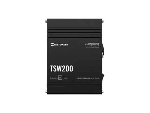 TSW200 er en unmanaged industriswitch med 2 SFP-porte til fiberoptisk kommunikation med lang rækkevidde og 8 Gigabit Ethernet-porte, der understøtter IEEE802.af og IEE802.3at Power-over-Ethernet-standarder. Den er klassificeret som strømkildeudstyr (PSE) og muliggør centralisering af strømforsyningen, hvilket giver op til 30 watt pr. port og reducerer indsatsen for at installere strøm.