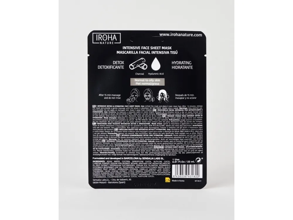 Detoxifies the skin, reinforces hydration and absorbs impurities The biodegradable Detox and Hydrating Sheet Mask detoxifies the skin, hydrates deeply and absorbs impurities, thanks to the combination of the detoxifying power of charcoal and the moisturizing power of hyaluronic acid.