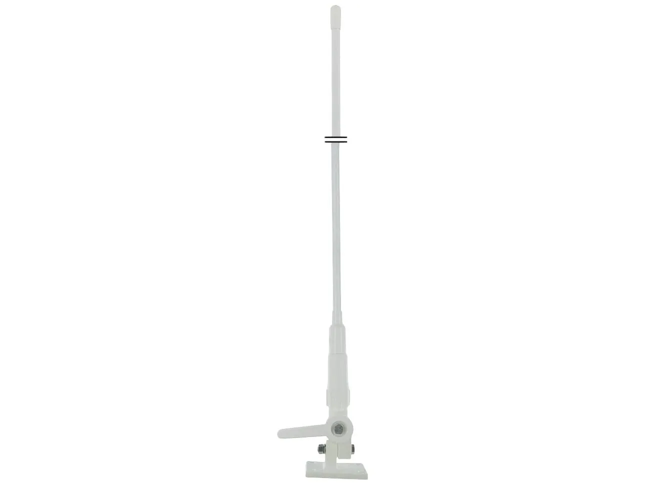 VHF marine-bådantenne med klapfod and 3 dBi forstærkning, monteringsmateriale og 4 m koaksialkabel Frekvensområde 156 - 162 MHz til alle internationale og nationale VHF-radioområder inkl. Verdensomspændende AIS og NOAA vejrradio (USA) Antennen har ikke brug for nogen metalflade som modvægt og kan også monteres på fiberglas og træopbygninger.