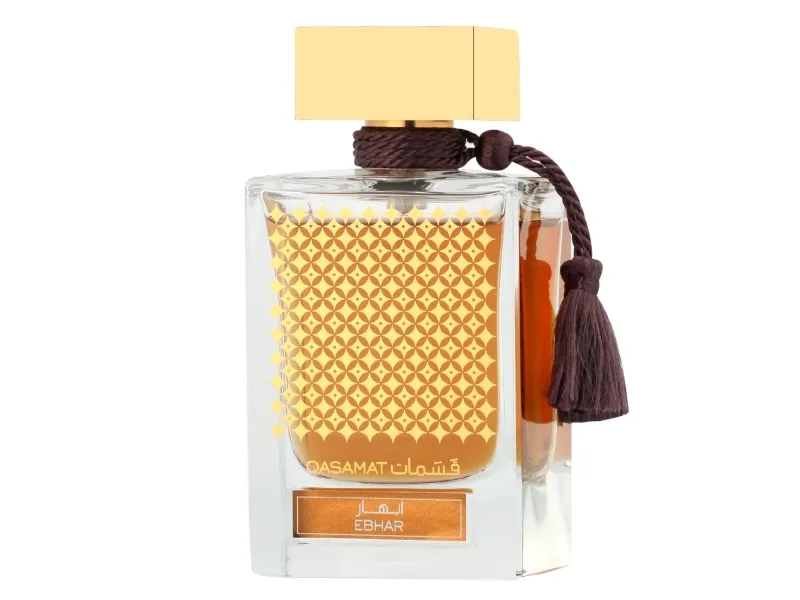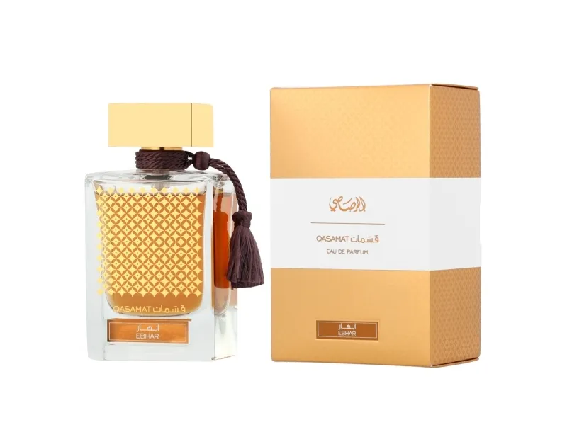 Dubai based perfumer Rasasi is the creative force behind Rasasi Qasamat Ebhar part of a series of four unisex fragrances inspired by Middle Eastern perfume traditions The fragrance features fruity top notes of energizing green apple and lemon and floral heart notes of Damask rose jasmine lotus flower and raspberry like orris Its intense evocative base notes of musk praline tonka bean and vanilla give the fragrance a deeply romantic character aspect that makes it especially ideal for evening wear and special occasions