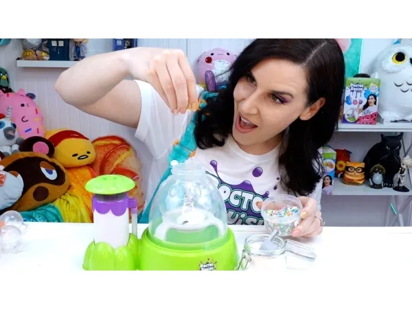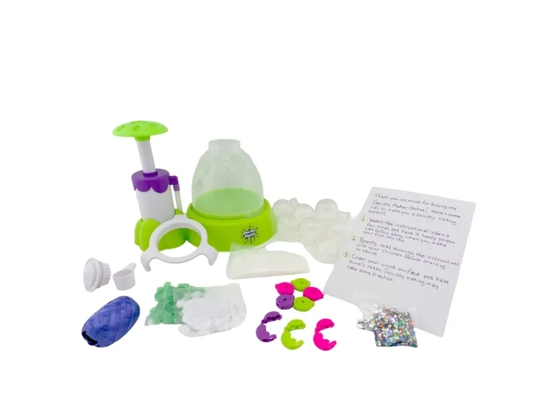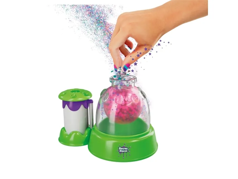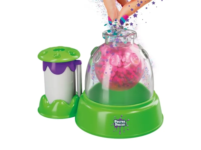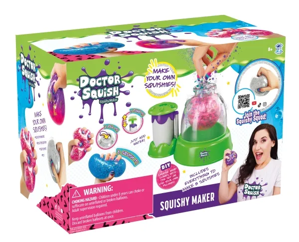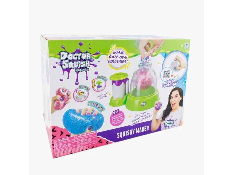 Skab dine egne squishy klemmebolde. Doctor Squish elsker at finde det bedste klemmelegetøj, og se hvad der er indeni! Hun kan godt lide at lave sine egne klemmebolde og alt, der kan klemmes på. Med Squishy maskinen kan du nu også lave dine egne squishies i 3 forskellige størrelser. Du skal bare tilsætte dekoration og slimpulver og derefter fylde op med vand. Du kan vælge at bruge, hvad der følger med maskinen, men du kan også anvende din egen dekoration. Fra 8 år. Inkluderer: - Squishy Maker maskine - 1 ske og slimpulver - 2 farvede latex balloner - 4 klare gennemsigtige balloner - glitter og konfetti - 3 genanvendelige klips - 1 bånd - 2 farveblækflasker