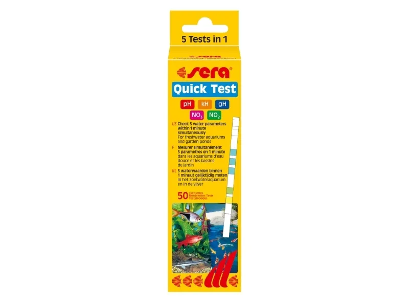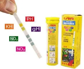 Teststickor som snabbt och basalt testar pH, kH, GH, NO, NO3 i akvariet. Doppa en teststicka i vattnet en sekund och jämför färgerna mot diagrammet på förpackningen efter en minut. Bör kompletteras med dropptester för exakta nivåmätningar. Snabb och enkel kontroll över dina vattenvärden.