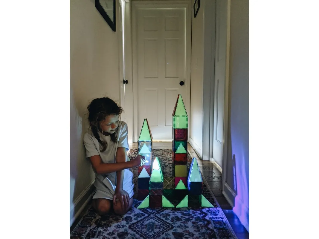 MAGNA-TILES® Glow 16 stk.! Med de unikke Glow byggebrikker, kommer kreationerne til live – i mørket, når de udsættes for sol el LED-lys. Glow er kompatible med andre MAGNA-TILES sæt. 3+ år