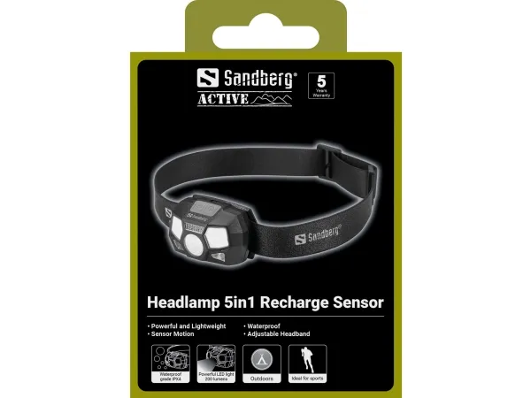Sandberg Headlamp 5-in-1 Recharge Sensor is your friend in the dark. With rechargeable battery and sensor that allows you to turn it on and off by simply waving your hand in front of the light. With super bright LED light, 5 adjustable light settings and red light option, and a long battery life, it is perfect for both outdoor adventures and everyday use in the garden or on a run. The adjustable strap ensures a comfortable fit and the waterproof construction makes it reliable in all weather conditions. Charge it easily via USB and always be ready for the next adventure!