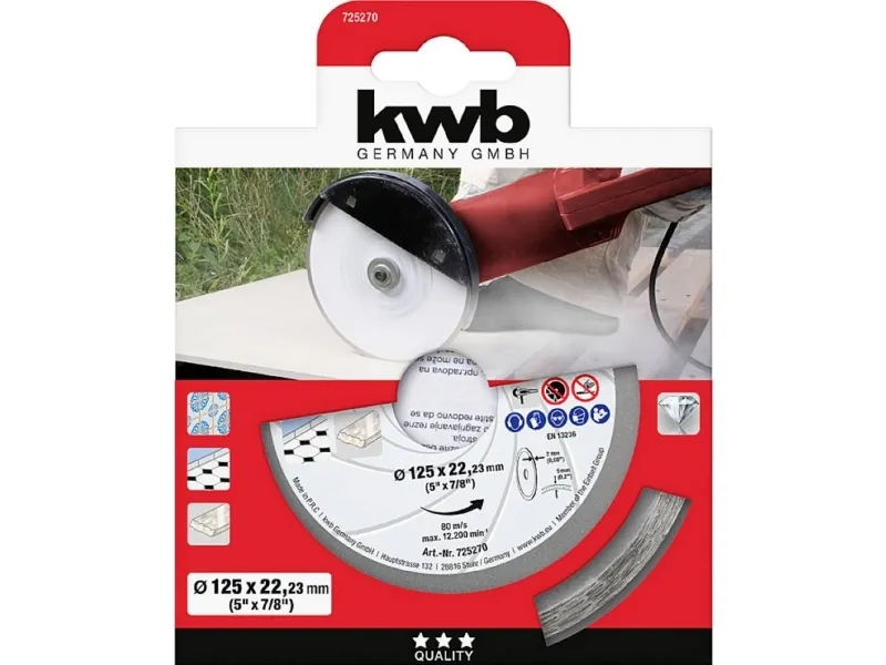 SILVER-line diamantskæreskiver til fliser og keramik Diamant-skæreskiver i målene 115 mm x 1,9 mm, 125 mm x 2,0 mm eller 230 mm x 2,4 mm med lasersvejset, lukket 5,0 mm-skærekant. Til rene og tynde snit i fliser, hulbloksten, tagskåle og keramik. Diamant-skæreskiver i vinkelslibere med en maks. En periferihastighed på 80 m/s, en skiveophænget på 22,23 mm. Diamant-skæreskiverne opfylder sikkerhedskravene i en 13236.