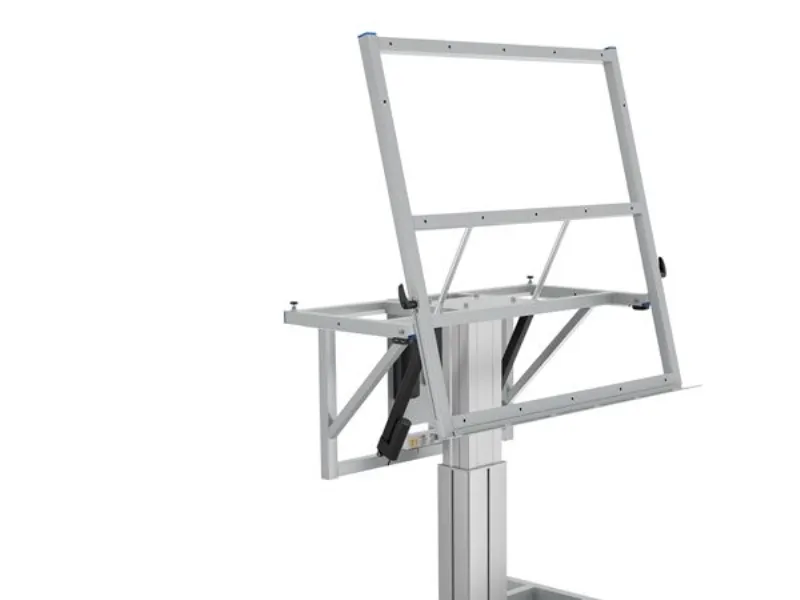 Et komplet motordrevet CE-mærket vinklingsbart montagebord med enkeltsøjlet stel, arbejdsfladen kan vippes op til 75º. Arbejdsfladen kan forlænges med 315 mm ved at flytte forkantlisten. Forkantlisten kan fungere som støtte eller som hylde til værktøj, men produkter på bordet SKAL skrues fase ind i bordrammen eller i bordpladen. Regulering af arbejdshøjde og vinkling sker med håndbetjeninger placeret til højre eller venstre side af stativet. Dette vippebord er tænkt som et ergonomisk og rationelt monteringsbord. Alle bordstativets ståldele er fuldsvejste og bordet er meget stabilt. Montagebordet leveres færdigmonteret og funktionstestet. leveret på en EUR palle. Ekskl. bordplade. Hjulsæt fås som tilbehør varenummer 624802.