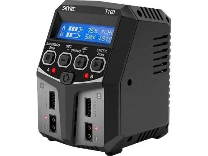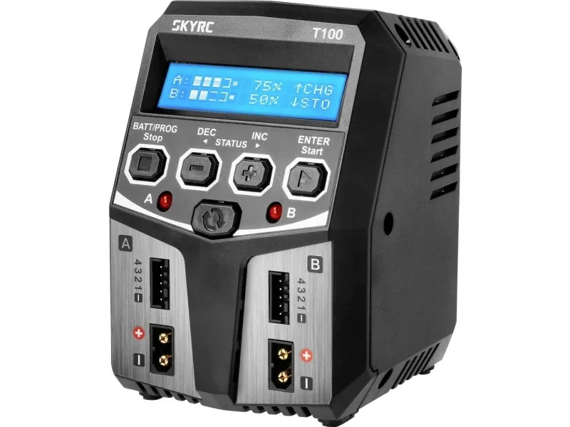 The SkyRC T100 charger is a dual-channel charger capable of charging or discharging all the most common battery types. The clever design allows seamless connection to the balancer ports and the XT60 plug. The charger is small in size, but has as much as 100 watts of power to charge the battery at 5 amps. The charger also has AGM and cold charge modes for charging lead-acid and AGM batteries at lower temperatures.